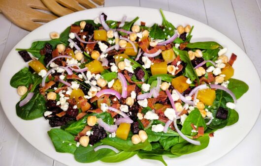 Spinach, beets, bacon, blue cheese, hazelnuts & red onions with a Dijon Vinaigrette salad dressing.