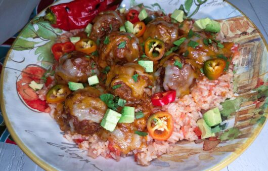Baked Enchilada Meatballs made with tender ground beef, smothered in flavorful enchilada sauce and melted cheese, served over Spanish rice.