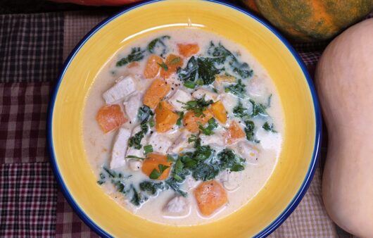A Cozy Autumn Stew of Chicken, Butternut Squash, Kale, and Parmesan.