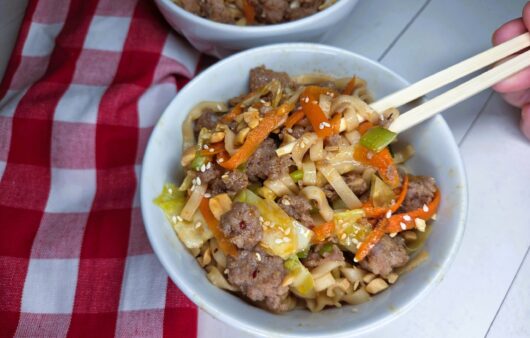 All the delicious, popular flavors of egg rolls in a bowl with noodles.