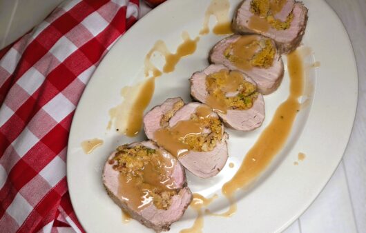 Tender pork loin, filled with savory cornbread stuffing and flavored with crispy bacon, thyme, and sage, topped with rich, flavorful