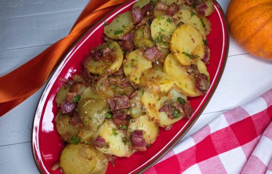 Warm, smoky, and tangy, this authentic German potato salad combines crispy bacon, zesty vinegar, fresh herbs, and tender potatoes, soaking