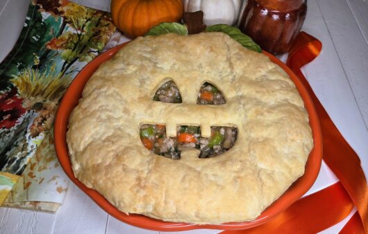 A cozy turkey pot pie, topped with flaky puff pastry shaped like a jack-o-lantern, festive comfort in every bite!