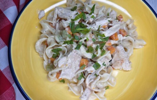 Delicious chicken and noodles, with carrots, celery, onion, garlic, herbs, and egg noodles, all blend perfectly in a rich, velvety