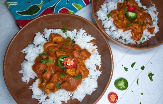 Seasoned chicken thighs are cooked in a creamy, curried tomato sauce made with yogurt and butter, resulting in a rich,