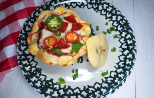 A delicious and hearty dish with patty pan squash stuffed with sausage, onions, mushrooms, zesty homemade pizza sauce, and melty