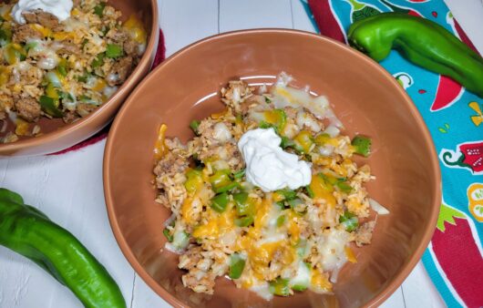 Delicious, easy Anaheim Pepper Skillet with Italian sausage, Mexican & Italian seasonings, rice, cheese & Anaheim Peppers.