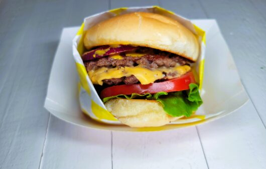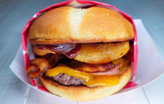 Nothing satisfies quite like a great burger! This burger has a juicy beef patty, crunchy onion rings, bacon, BBQ sauce