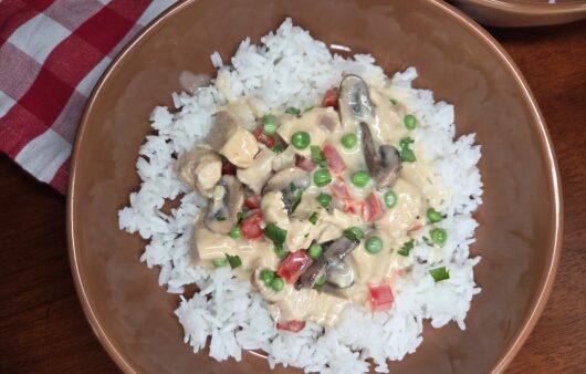 Quick, easy & delicious chicken with red bell peppers, shallots, mushrooms & peas in a creamy sauce.
