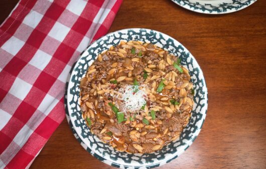 Easy One-Pot Manestra with orzo, ground beef, onions, herbs, and spices in a rich tomato sauce.