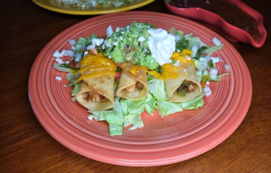 Delicious and easy Loaded Chicken and Green Chile Taquitos with guacamole, 2 kinds of cheese, and Pico de Gallo served