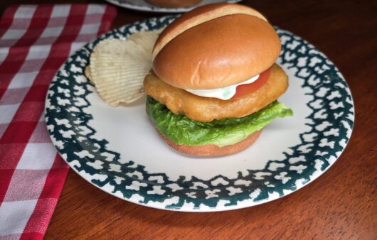 Crispy, golden fish fillets dipped in perfectly seasoned batter, layered on a toasted brioche bun with fresh lettuce, ripe tomato,