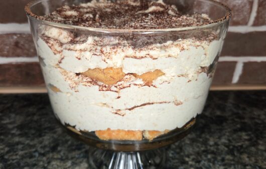 Tiramisu with homemade cinnamon, hazelnut cream filling, Kahlua, and coffee-dipped ladyfinger cookies, and cocoa powder—no baking required.