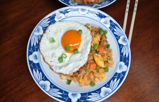 A bold, comforting bowl of kimchi fried rice topped with a crispy sunny‑side up egg.