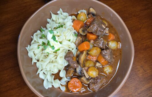 Tender, slow‑cooked beef and bacon in a velvety red‑wine sauce with classic French flair, finished with carrots, pearl onions, and