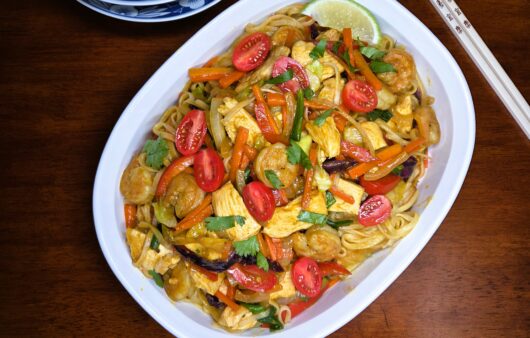 Easy Singapore Street Noodles with curry sauce, fresh veggies, shrimp, and chicken are bursting with flavor and loaded with vibrant