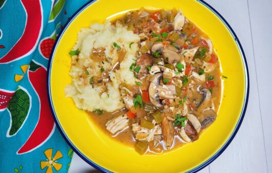 A hearty chicken stew featuring seasoned, tender chicken, cooked alongside red bell peppers, onions, celery, and mushrooms in a rich