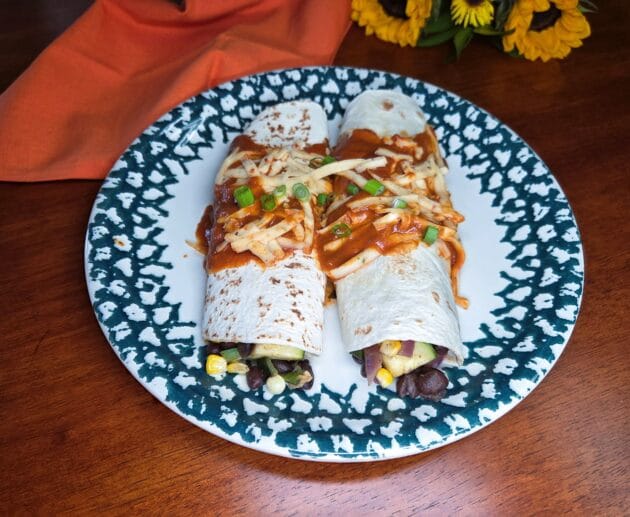 Delicious vegetable enchiladas with vegan enchilada sauce and cheese.