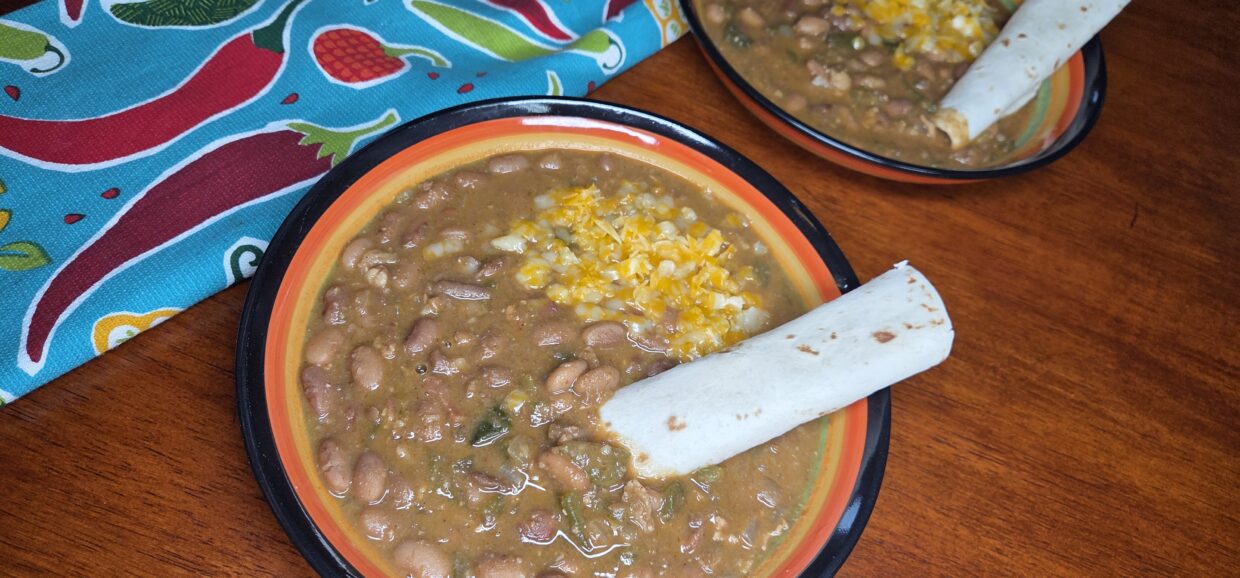 Slow-simmered pinto beans with warming spices, green chiles, jalapeno peppers, and bacon.