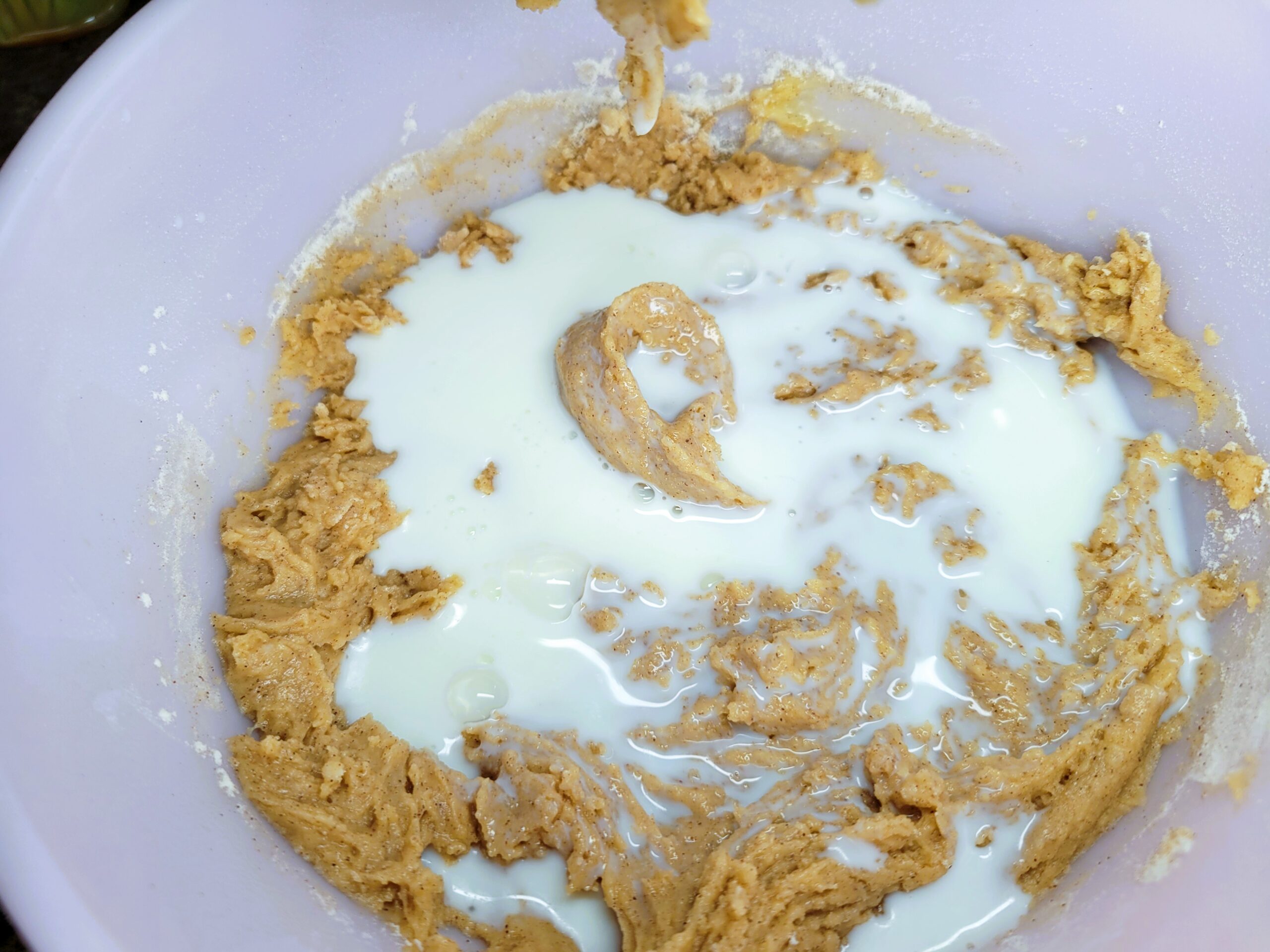 Next add 1/2 cup of milk to the cake batter and mix again until combined.