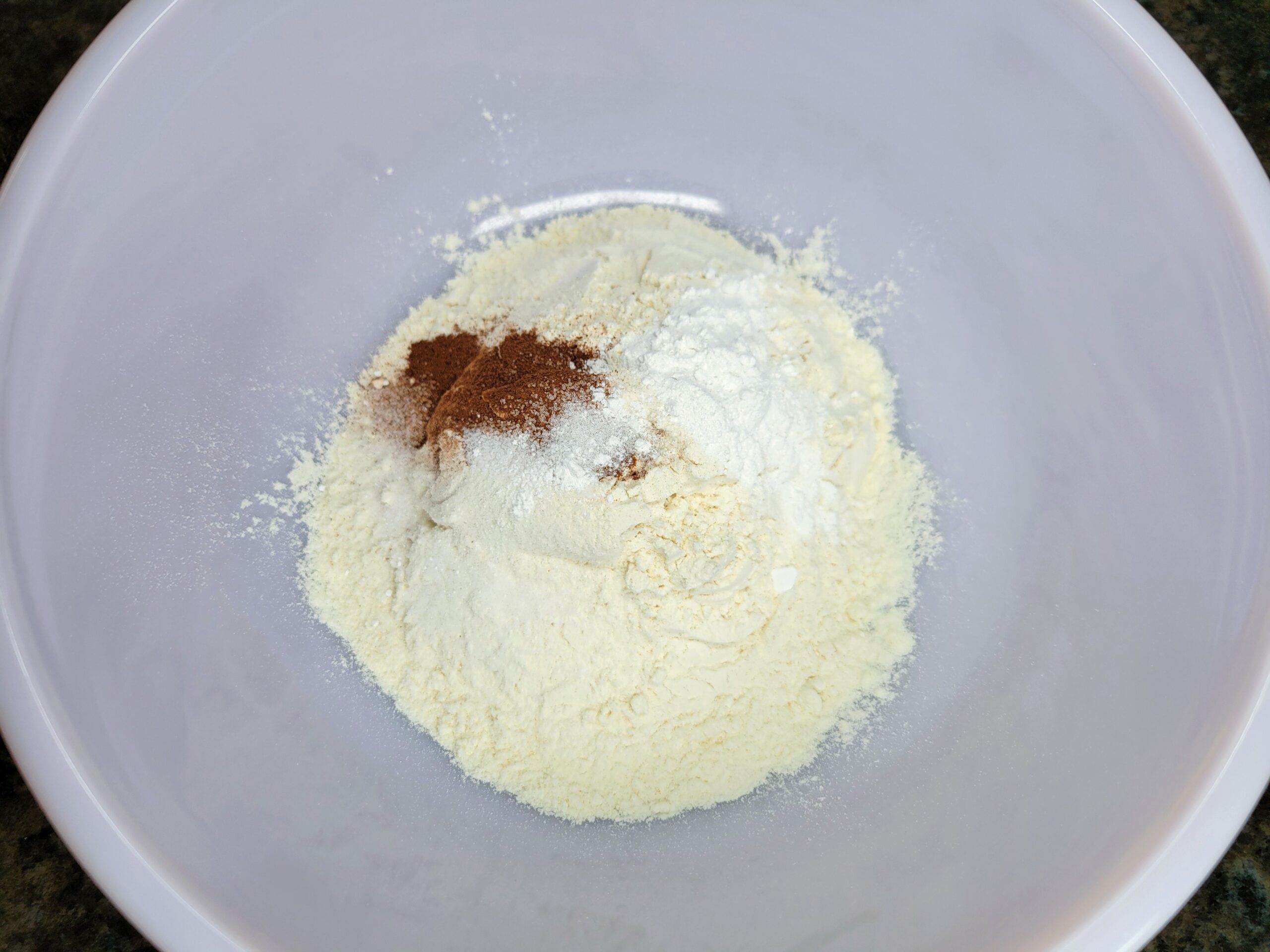 To make the cake, mix 1 1/3 cups of flour, 1 1/4 teaspoons of cinnamon, 2 1/4 teaspoons of baking powder, and 1/2 teaspoon of salt in a large bowl.