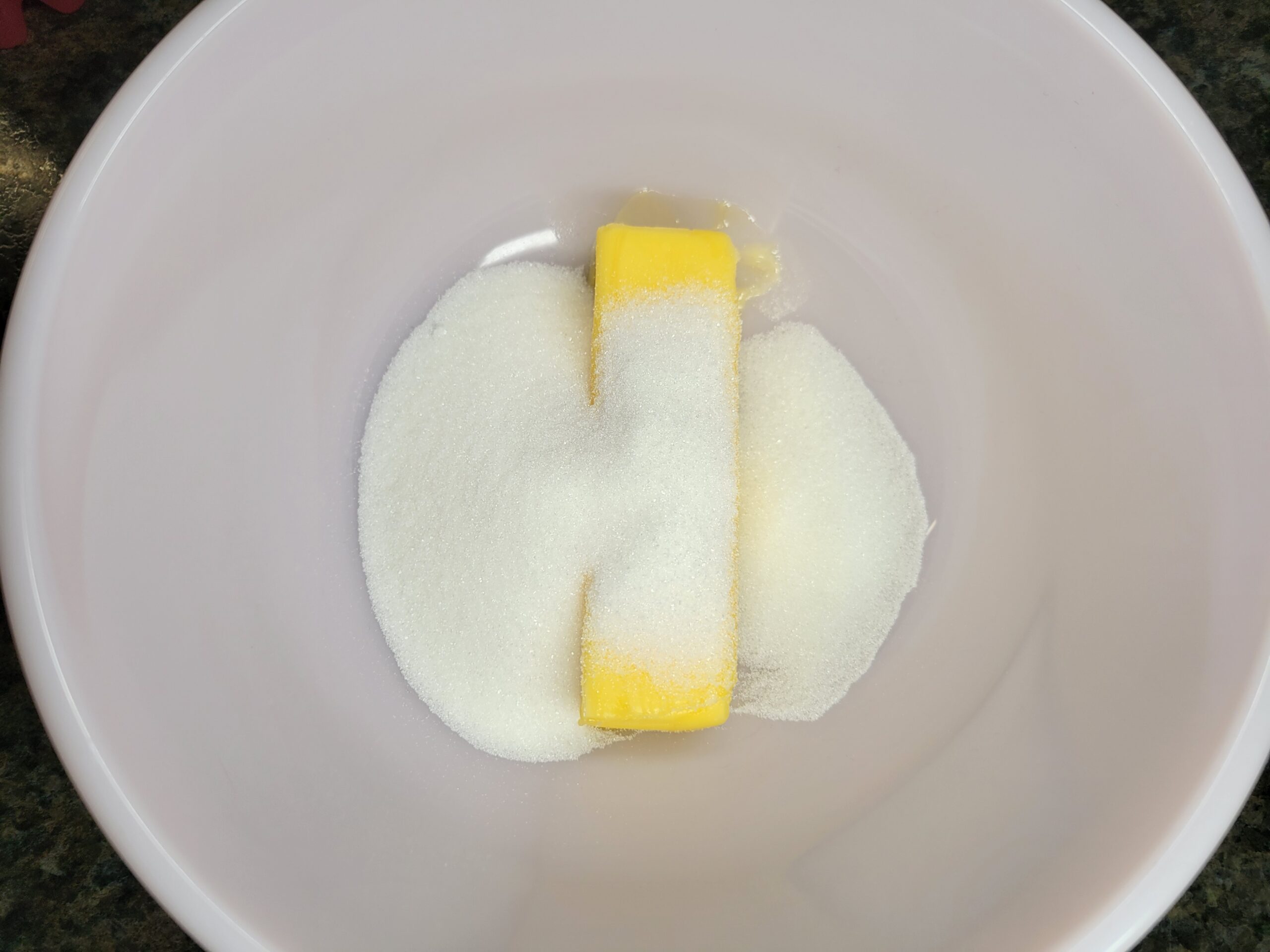 In a separate mixing bowl, use an electric mixer to beat 1/2 cup of room temperature butter, 1/2 cup of granulated sugar until combined. Then, add two beaten eggs and mix until the mixture becomes fluffy.