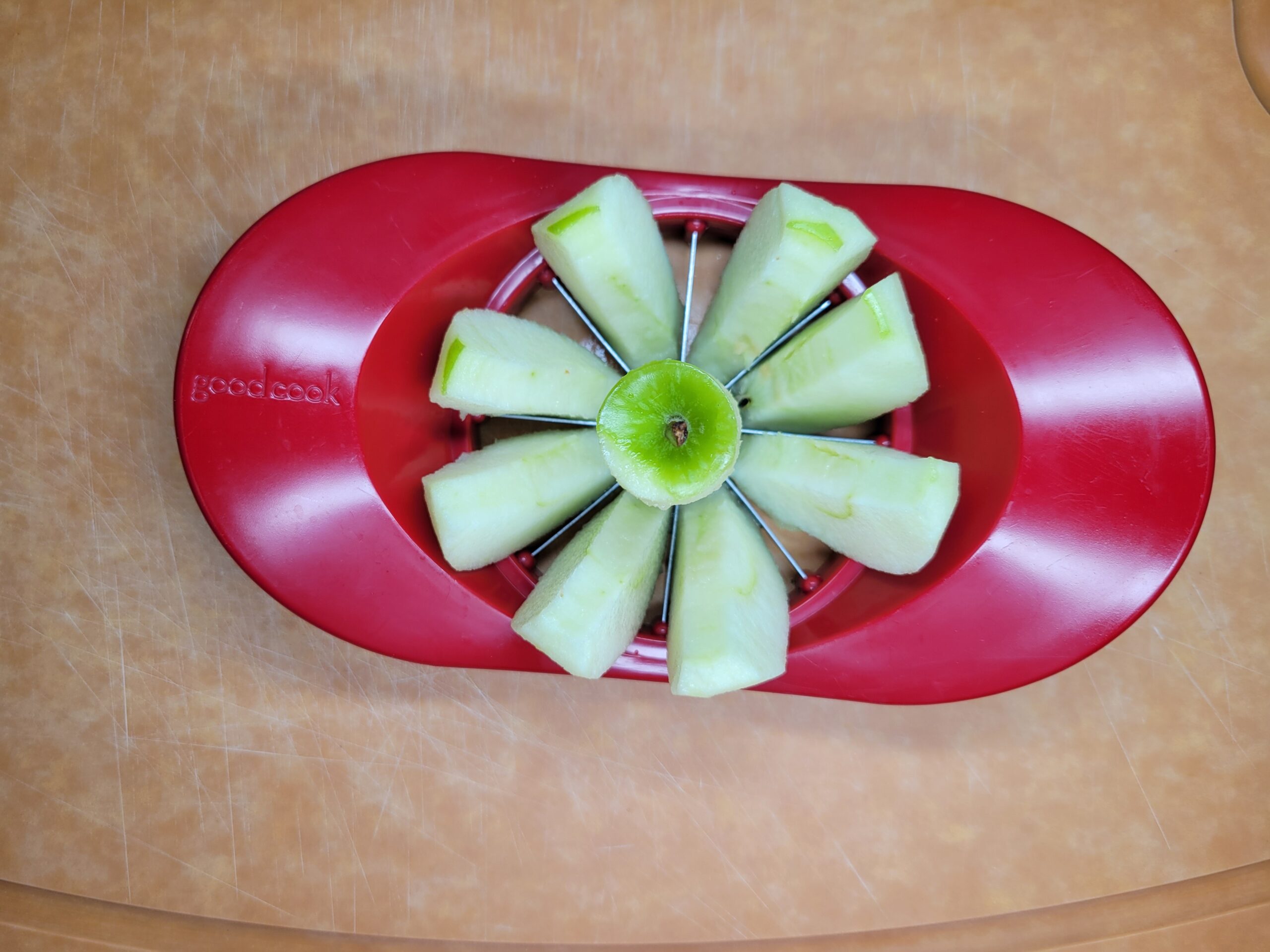 Peel, core, and slice the apples, then set them aside. For larger apple pieces like those in the photos, keep the slices thick, around 1 1/4 to 1 1/2 inches. If you prefer thinner slices, aim for a thickness of 1/2 to 1 inch.