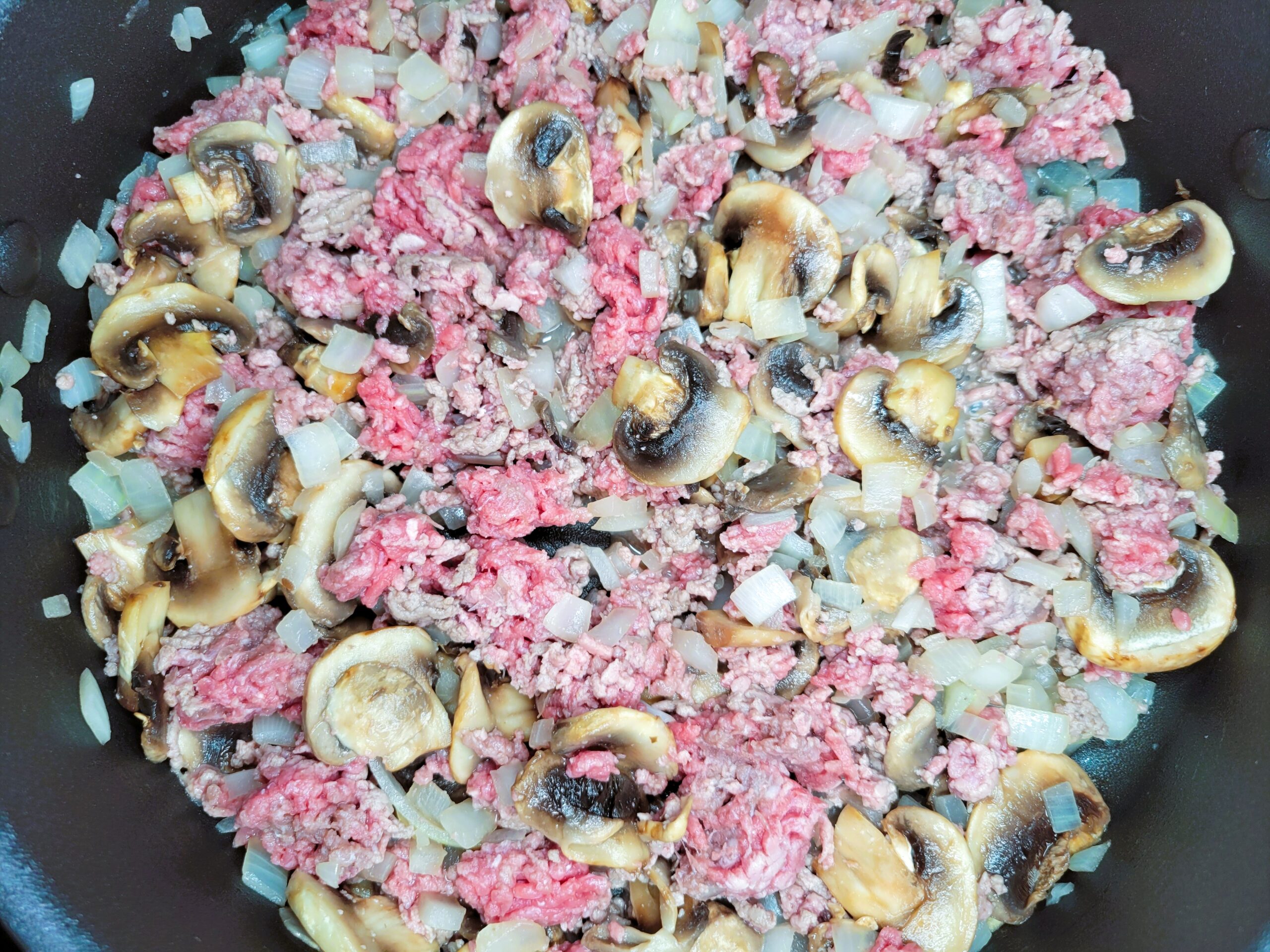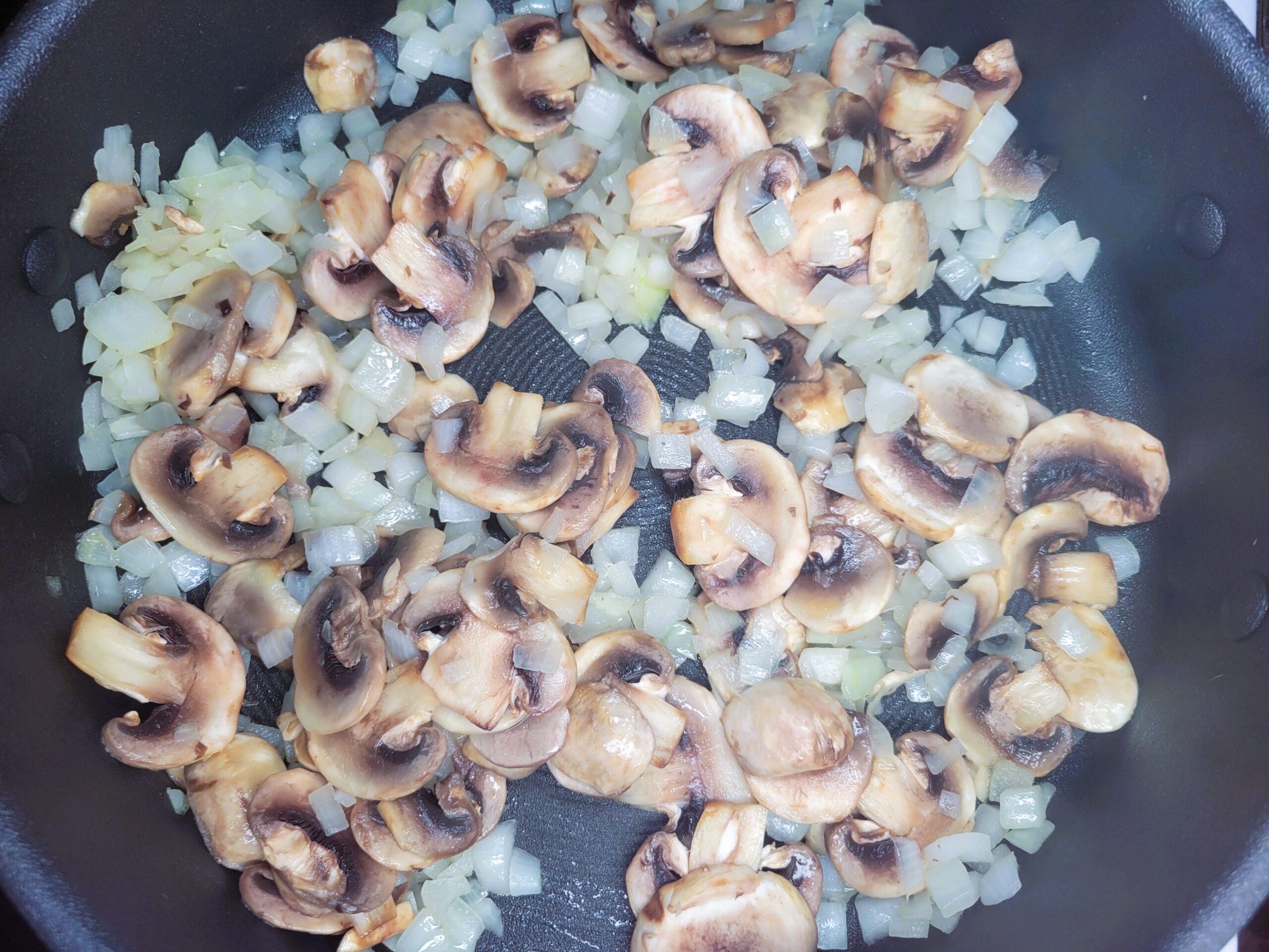 Boil a pot of water for pasta, following the package directions. Dice one medium yellow onion and slice 10-12 small mushrooms. Heat a large skillet with tall sides over medium heat, add a tablespoon of olive oil, and toss in the diced onion. Sauté the onion for a few minutes until softened, then add the sliced mushrooms and 3 minced garlic cloves. Sauté for another couple of minutes.