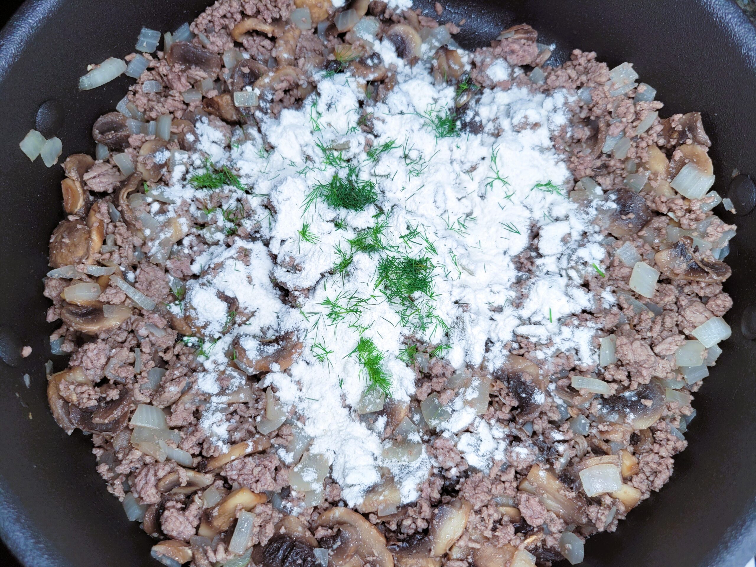 Add in 3 tablespoons of flour and 1 tablespoon of freshly chopped dill. Stir until combined, cooking for 1-2 minutes.