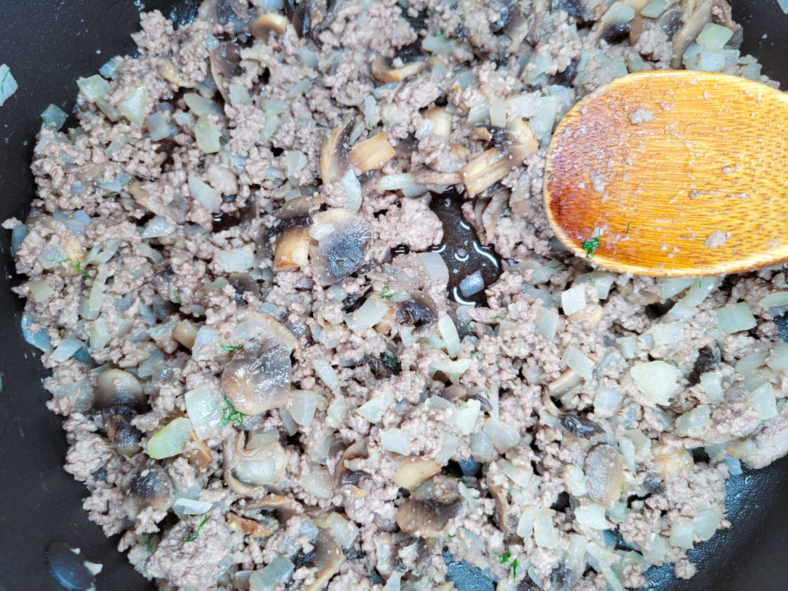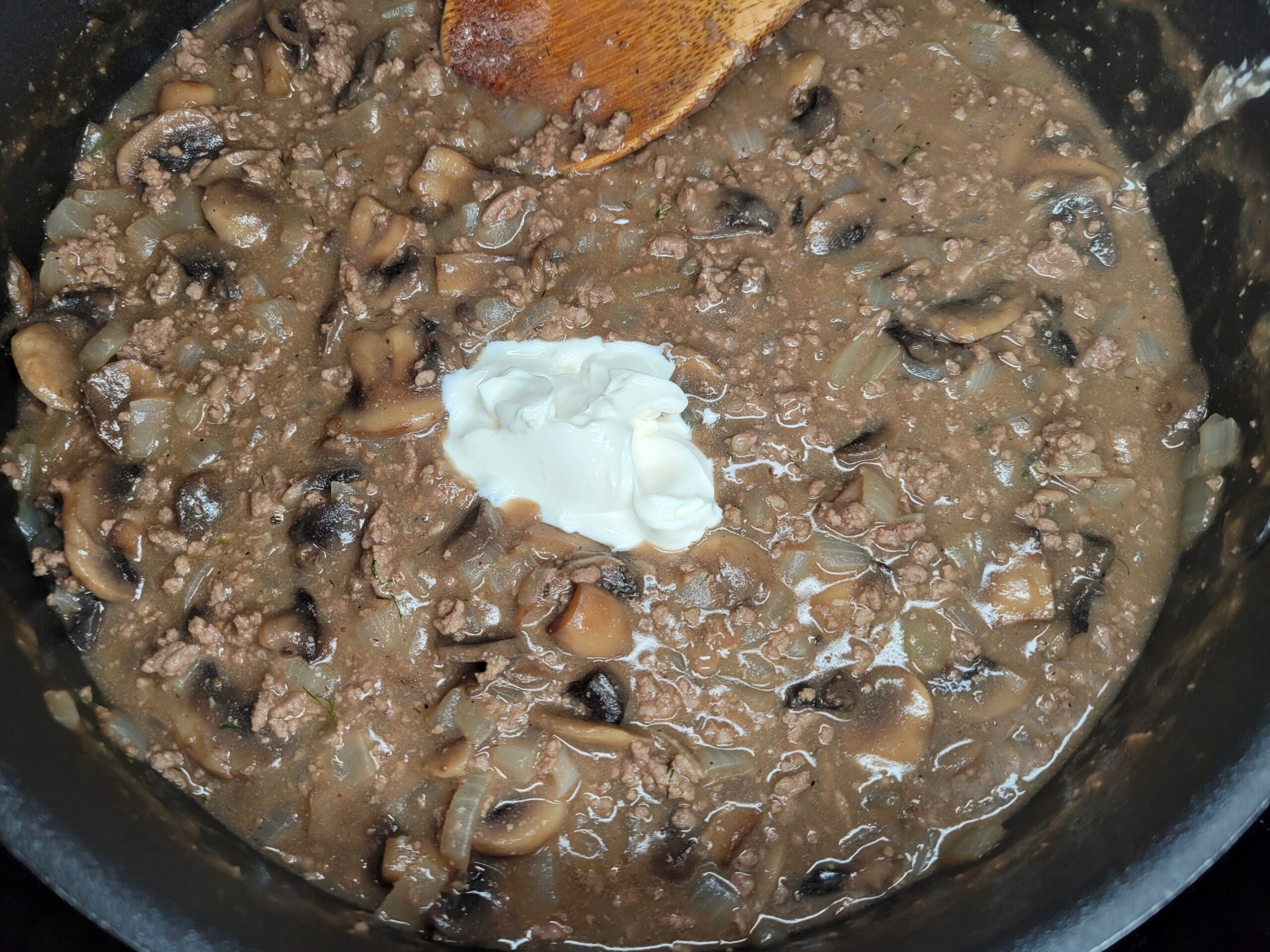 Creamy sauce with ground beef, mushrooms, herbs, red wine & sour cream over noodles.