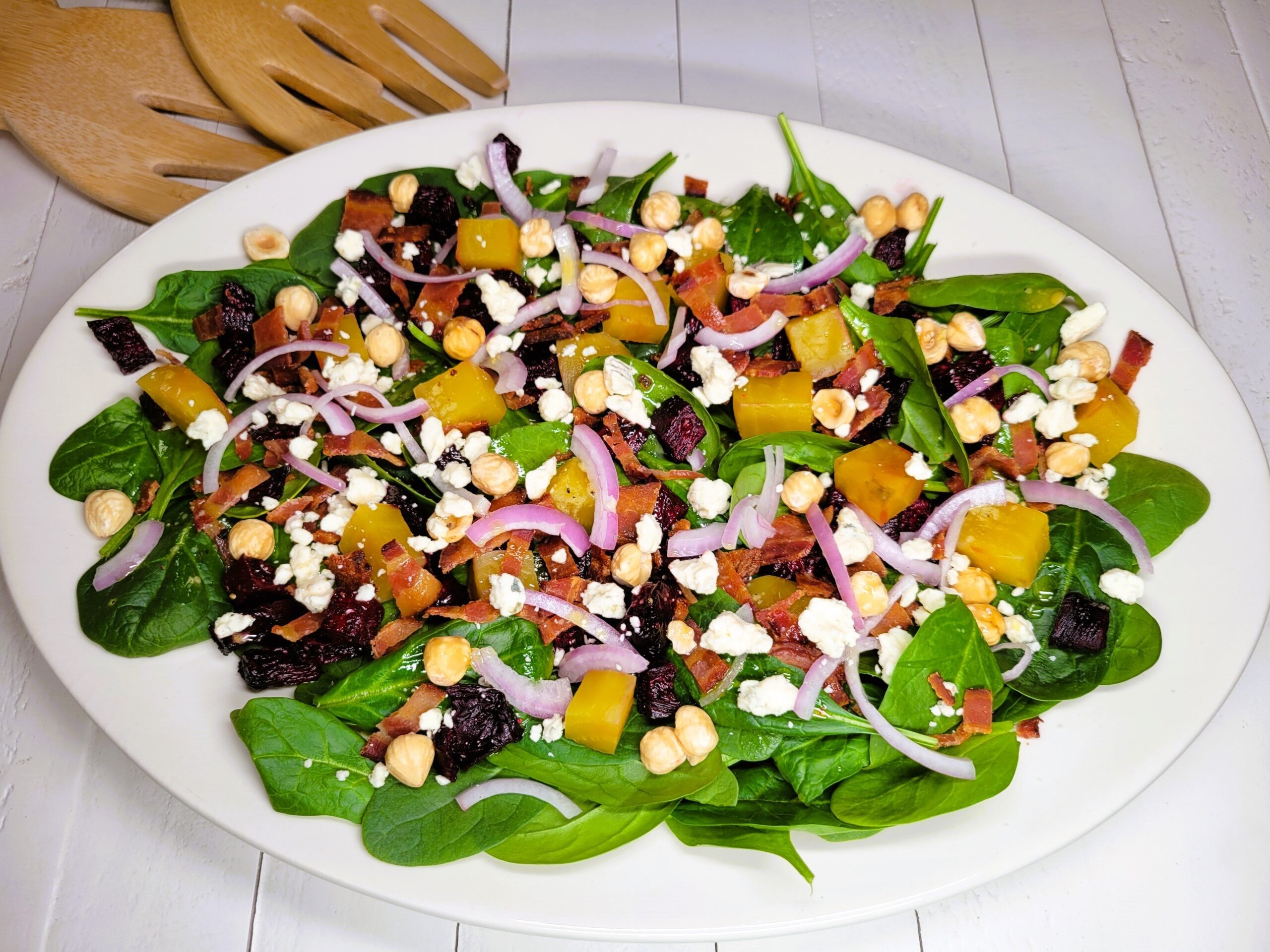This vibrant spinach salad bursts with flavor from roasted beets, crispy bacon, tangy blue cheese, toasted hazelnuts, and red onions, all tied together with a zesty Dijon vinaigrette salad dressing.