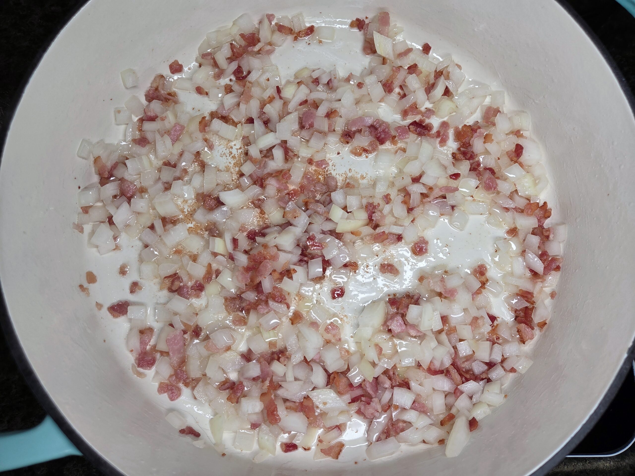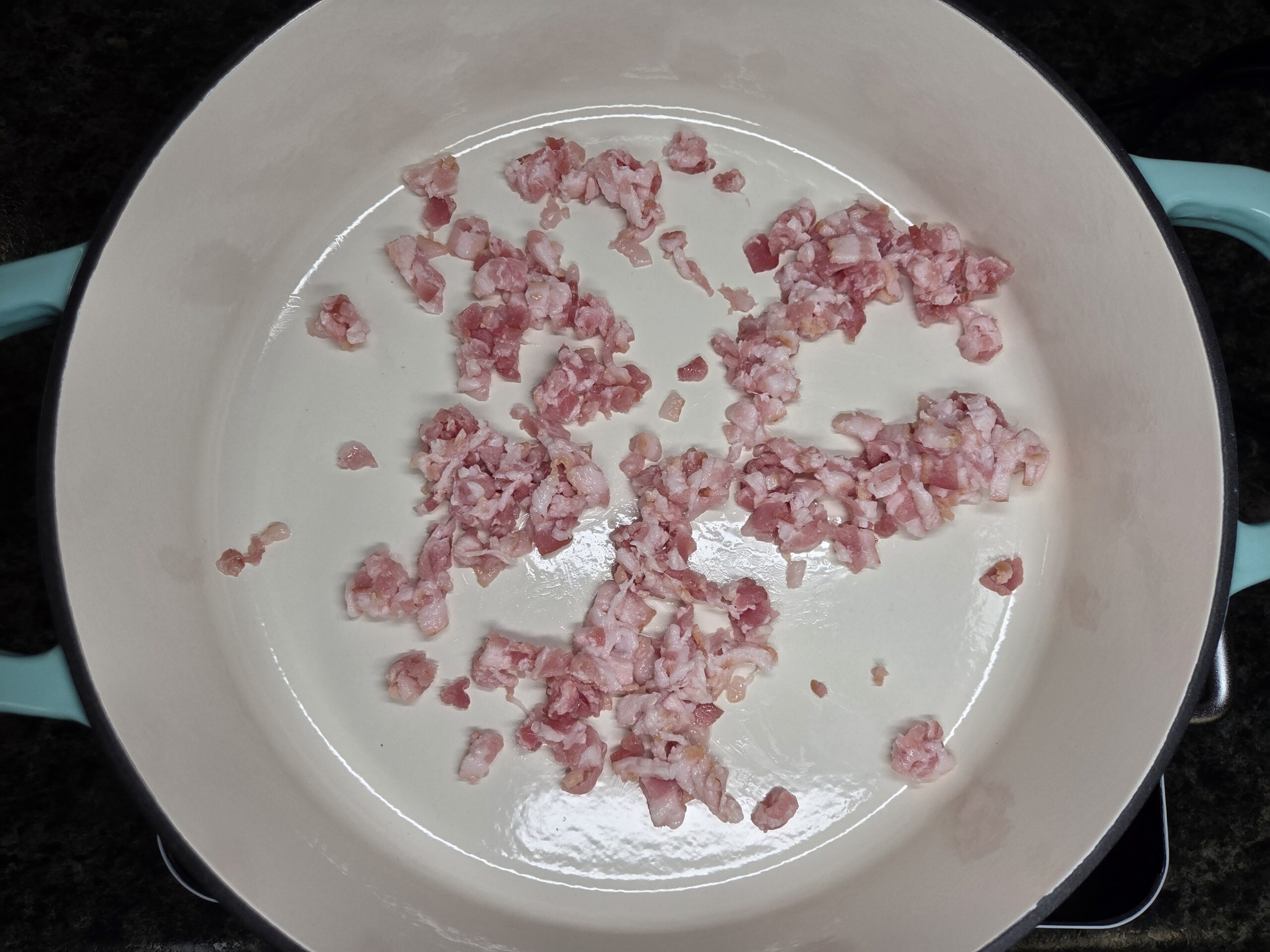 Finely chop 4 pieces of raw bacon and add them to a large heavy-bottomed pot or cast-iron skillet over medium heat. Cook the bacon until it turns golden brown, making sure not to cook it all the way through.