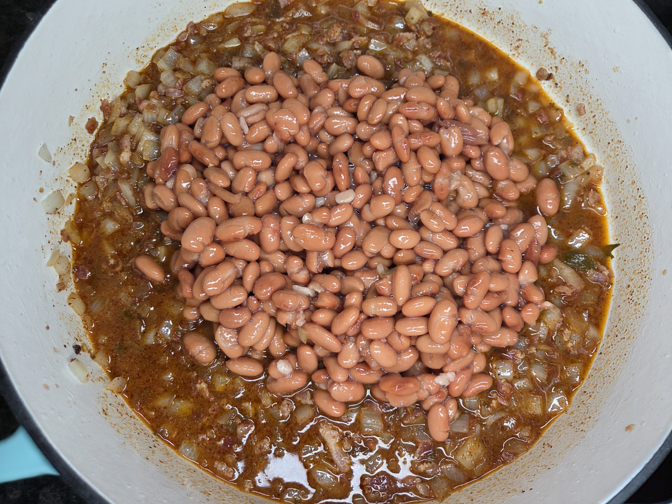 Cook the beans until the liquid reduces and thickens.
