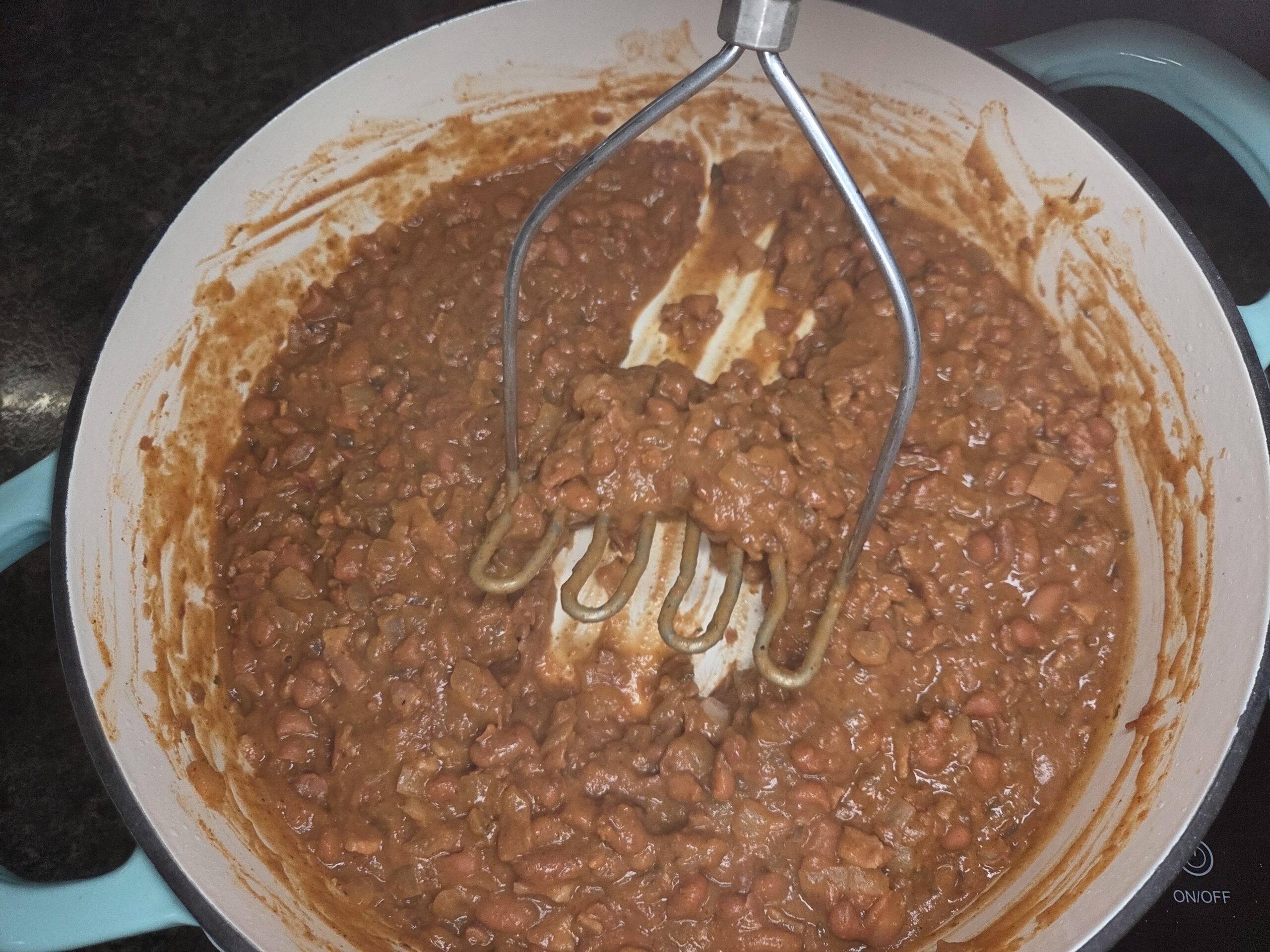 Mash the beans with a potato masher, stirring and mashing until you reach your desired consistency.