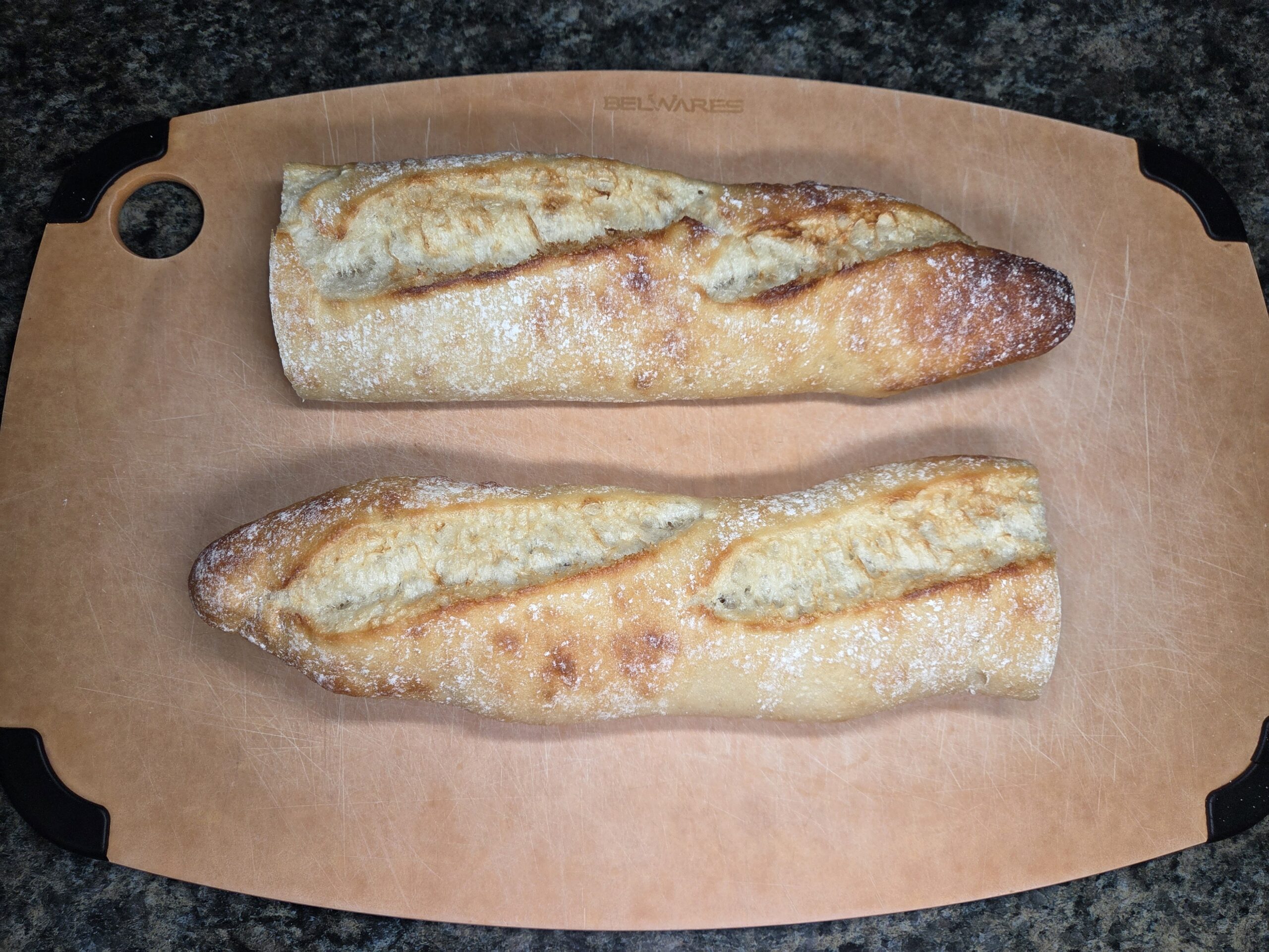 Prepare the bread. Slice the baguettes in half widthwise, then slice them in half lengthwise to create shorter segments, making them easier to handle and fit nicely on a baking sheet. I used two 20-inch baguettes as I really like their crispness; other options are sourdough slices, ciabatta, or French bread, anything sturdy and that you enjoy.