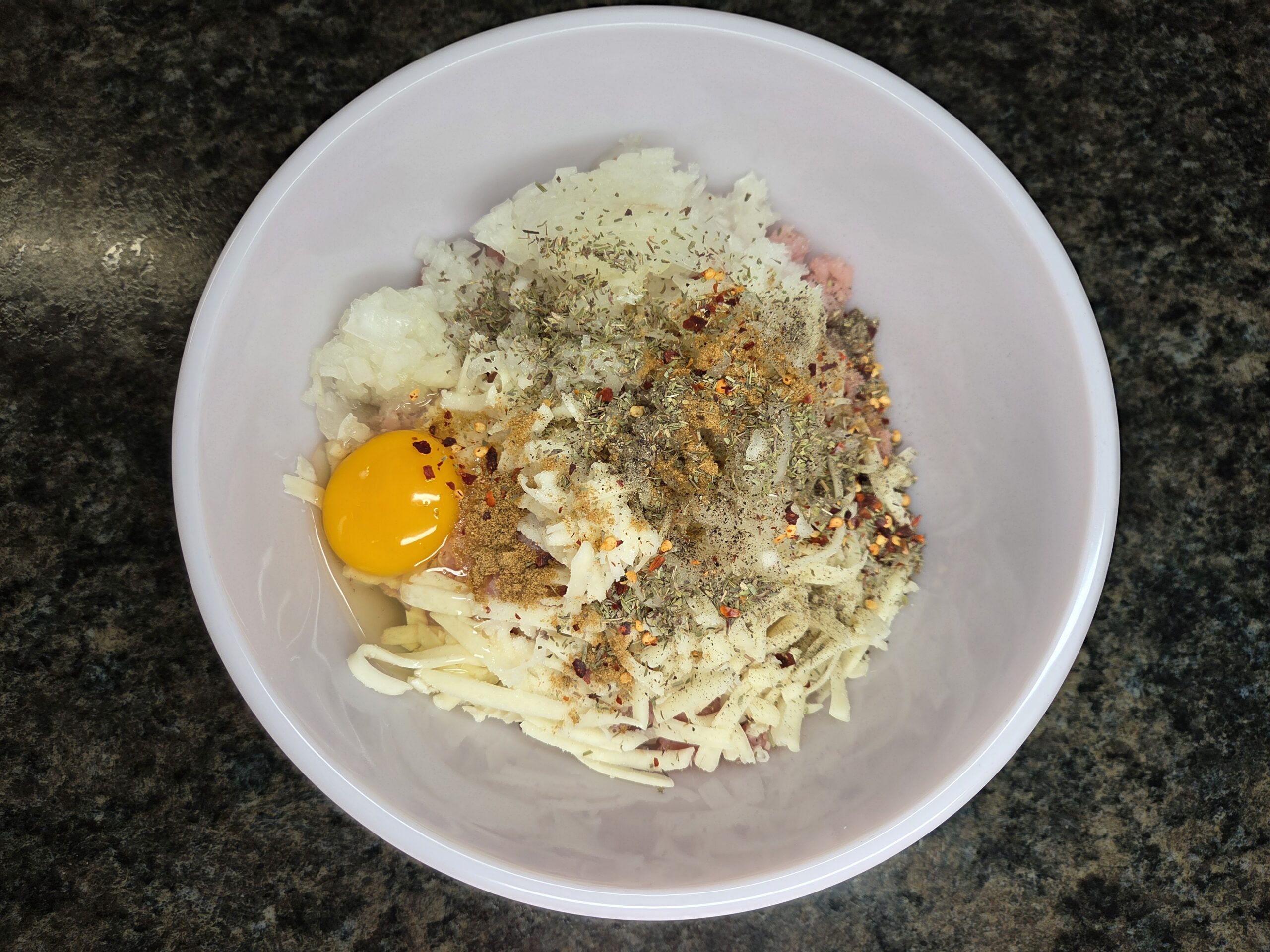 Preheat oven to 425°F. In a large bowl, mix together 1 pound of ground pork, 1/2 cup shredded mozzarella, 1/4 cup Monterey Jack, 1 egg, 1 teaspoon salt, 1/2 teaspoon black pepper, 1 teaspoon ground cumin, 1–2 teaspoons summer savory seasoning, 1/4 teaspoon red pepper flakes, and 1 small grated yellow onion. Use your hands to gently combine until just mixed.