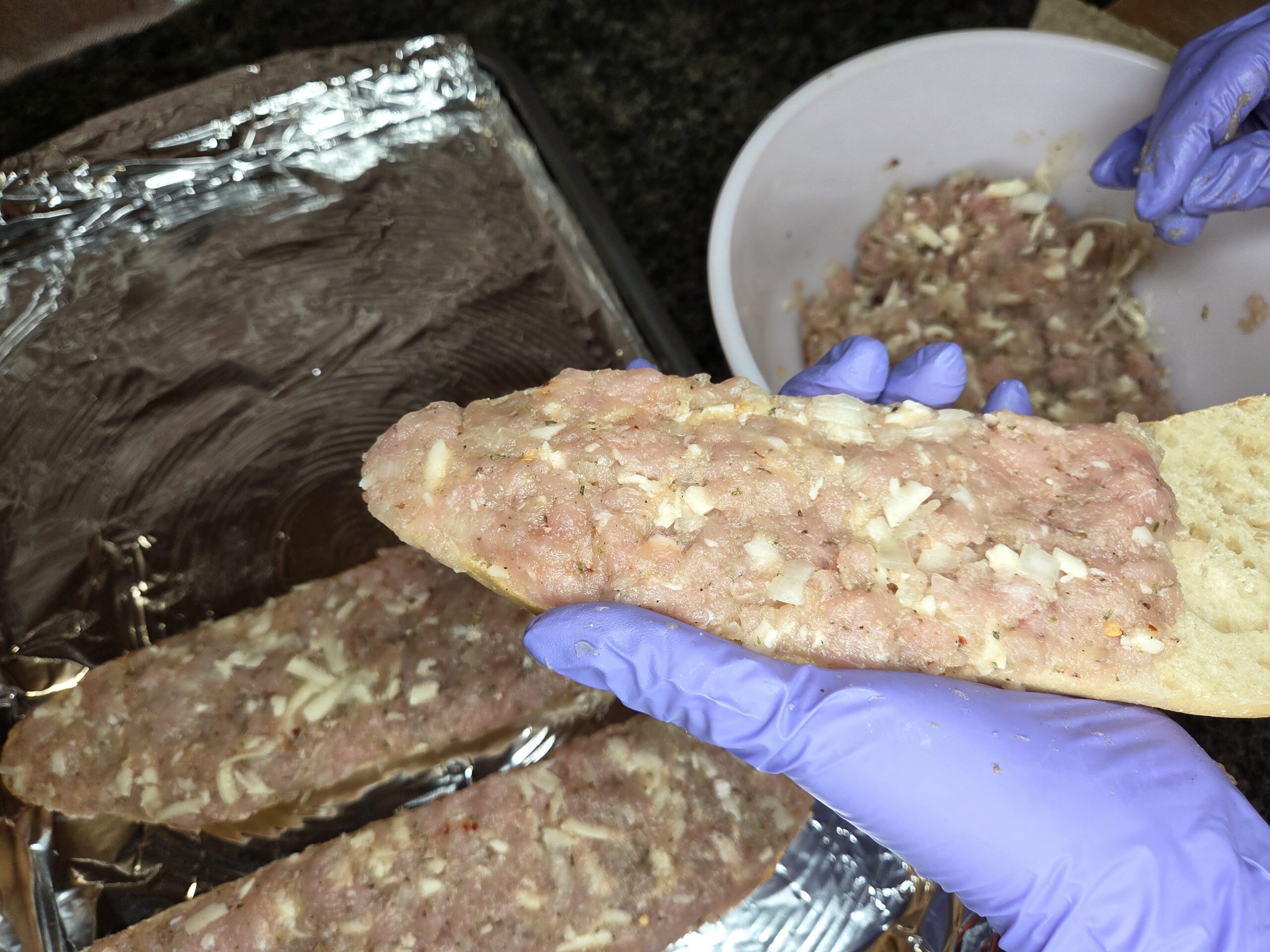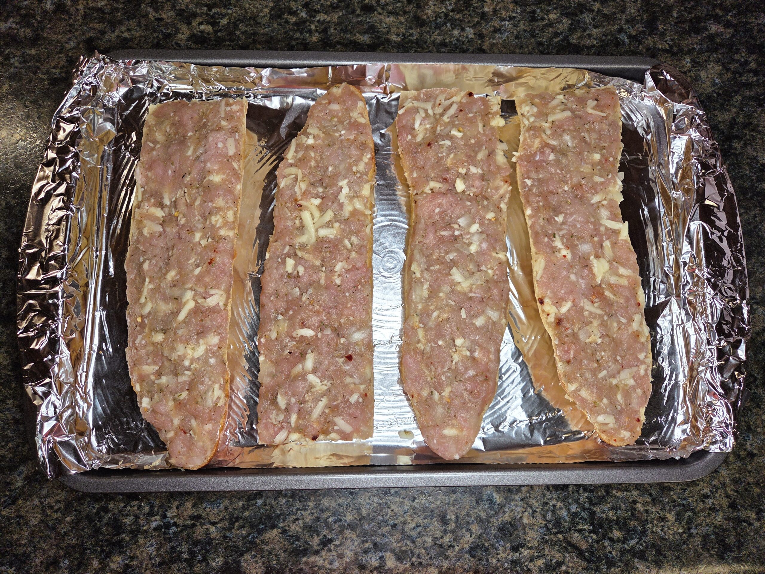 Arrange the cut pieces of baguette on a baking sheet with the cut sides facing up. Spoon the meat mixture onto each piece and spread it into an even layer, about â…› to ÂĽ inch thick, making sure to cover the entire surface all the way to the edges.
