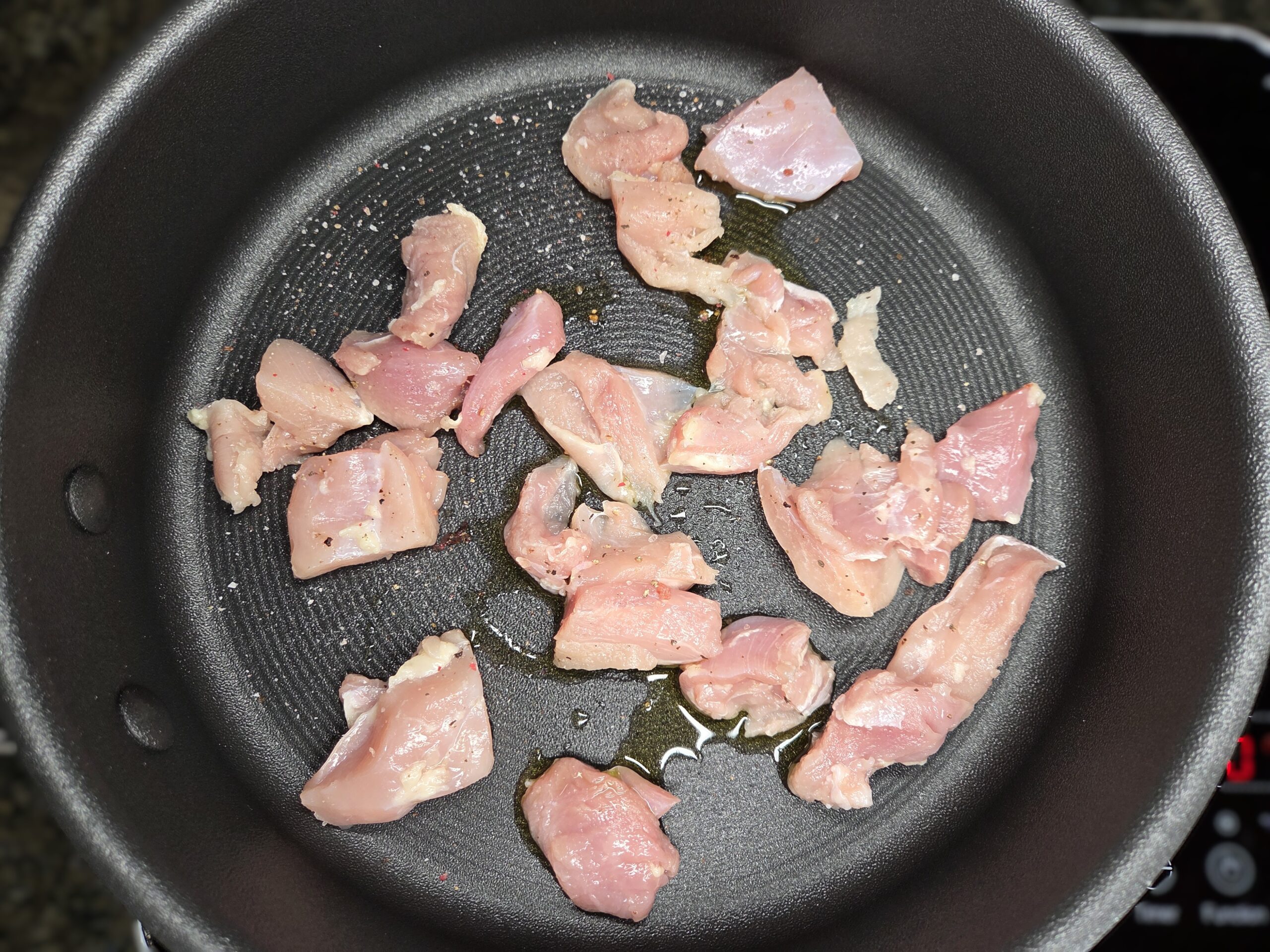 Start cooking the rice first, as it takes the longest to prepare, following the package instructions. Rinse the chicken thighs and pat them dry with a paper towel. Cut the chicken into 1-inch pieces and season with salt and pepper. Heat a medium skillet over medium heat and add a tablespoon of olive oil. Sear the chicken in batches until browned, then remove it from the skillet and set aside—it will finish cooking in a later step. Wipe the skillet clean.