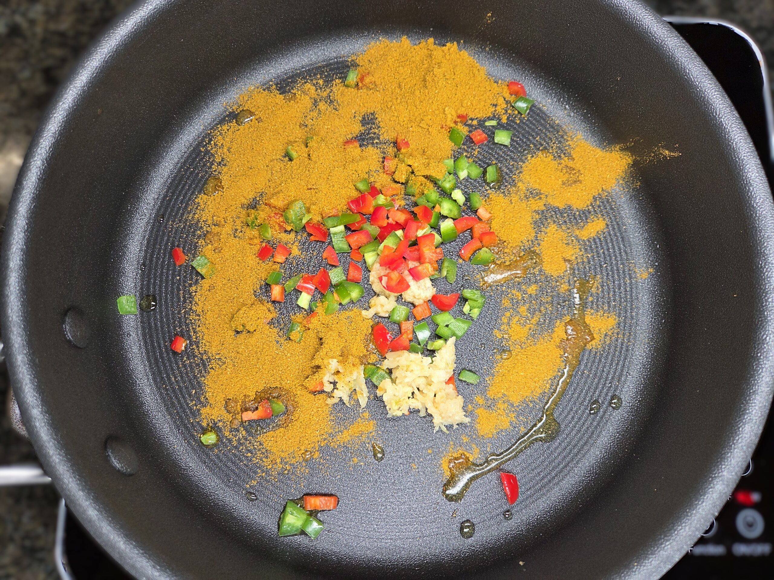 Stem, seed, and remove the membranes of 1 jalapeño pepper, then dice it very finely. Heat 2 teaspoons of olive oil in a skillet and add the diced jalapeño, 2 tablespoons of curry powder, 2 teaspoons of ginger (fresh or paste), and 4 minced garlic cloves. Cook the mixture for 2-3 minutes, just until it becomes fragrant.