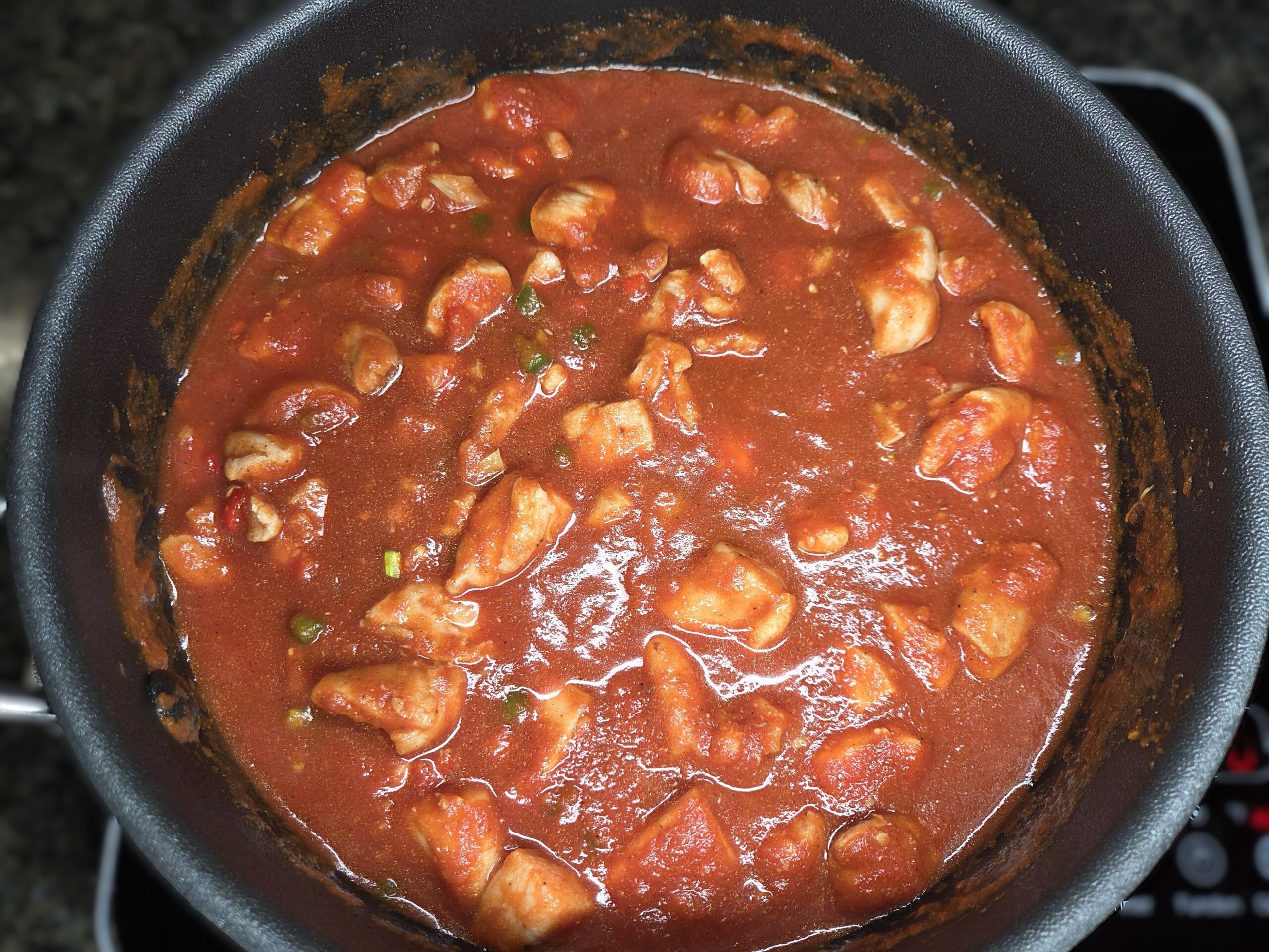 Next, pour in 15 ounces of tomato sauce and a tablespoon of honey, stirring until everything is well combined. Return the chicken and any accumulated juices to the skillet. Bring to a boil, then reduce to a slow simmer for 12-15 minutes or until chicken is thoroughly cooked through.