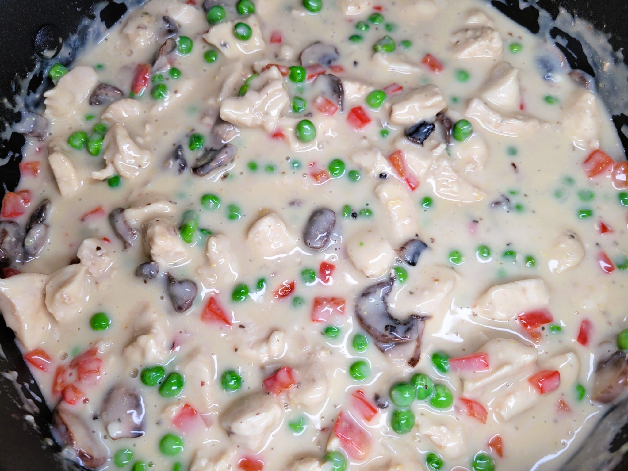 In a medium bowl, whisk together 1 cup of cold water, 4 teaspoons of chicken bouillon base, 1 cup of cold evaporated milk, and 3 tablespoons of cornstarch until smooth. Pour it into the skillet with the chicken and vegetables, bring everything to a gentle boil, then reduce the heat to a simmer. The sauce should thicken quickly. Stir in ¾ cup of thawed frozen peas and let the sauce continue to cook until it thickens to your liking.