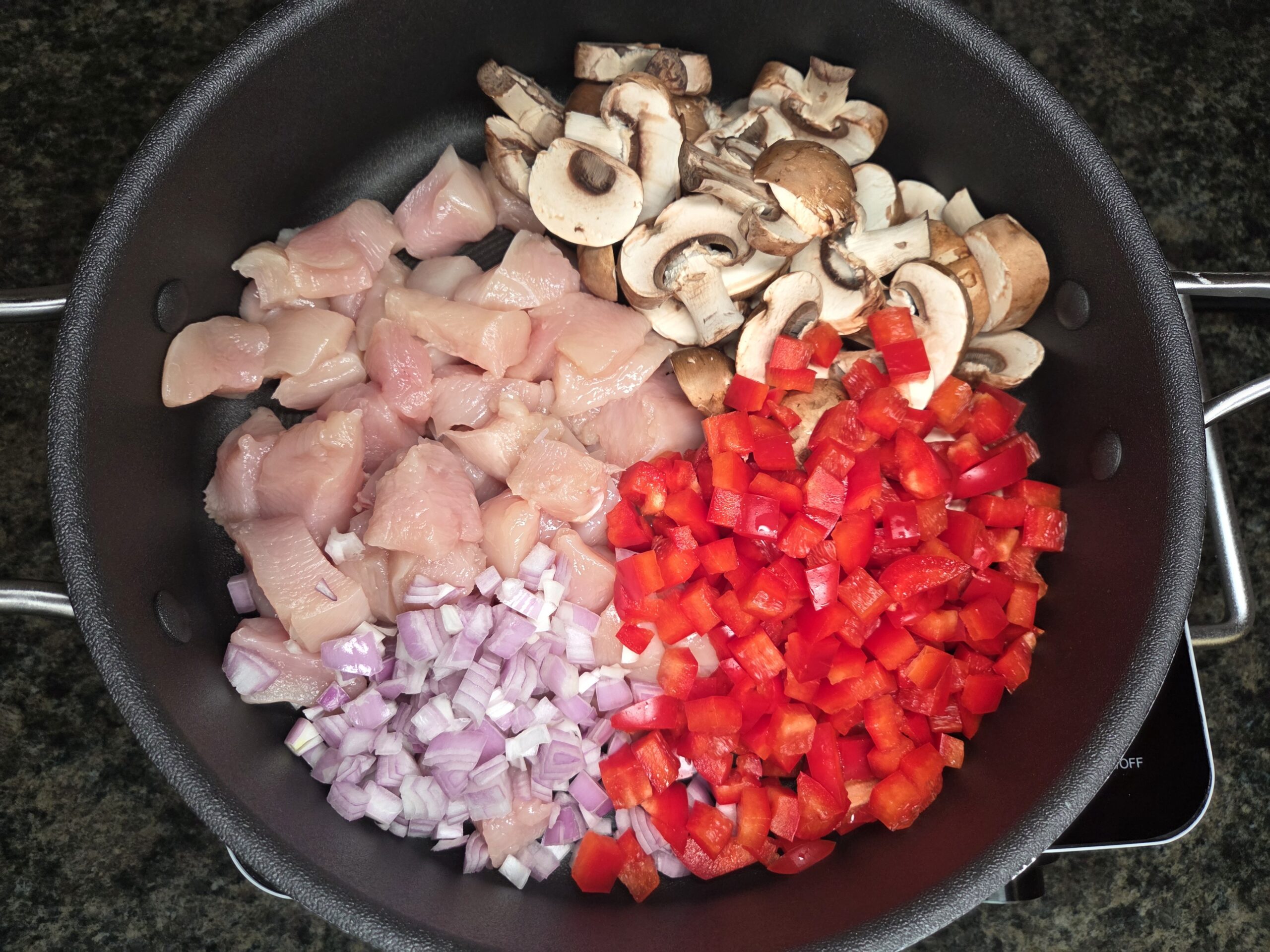 Pat the chicken dry and cut it into 1‑inch cubes. Stem, seed, and dice the red bell pepper, then dice the shallot and slice about 6 ounces of small mushrooms. Preheat a large skillet over medium‑high heat and add a tablespoon of olive oil. When the oil is hot, add the chicken and vegetables to the skillet.