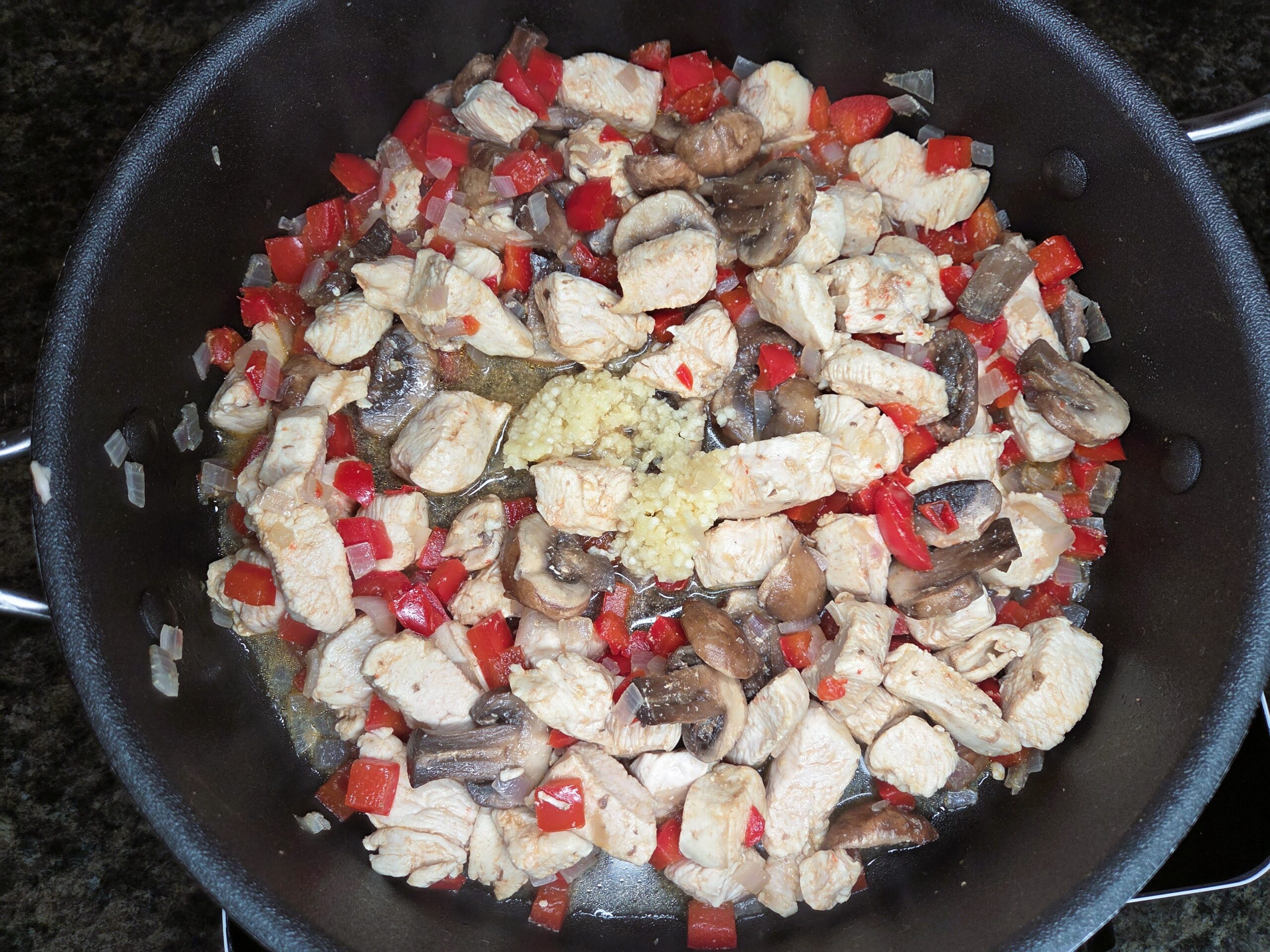 Sauté everything for 7–10 minutes over medium heat, or until the chicken is fully cooked and the vegetables have softened. Add 3 minced garlic cloves and cook for another minute or two, stirring often, until fragrant.
