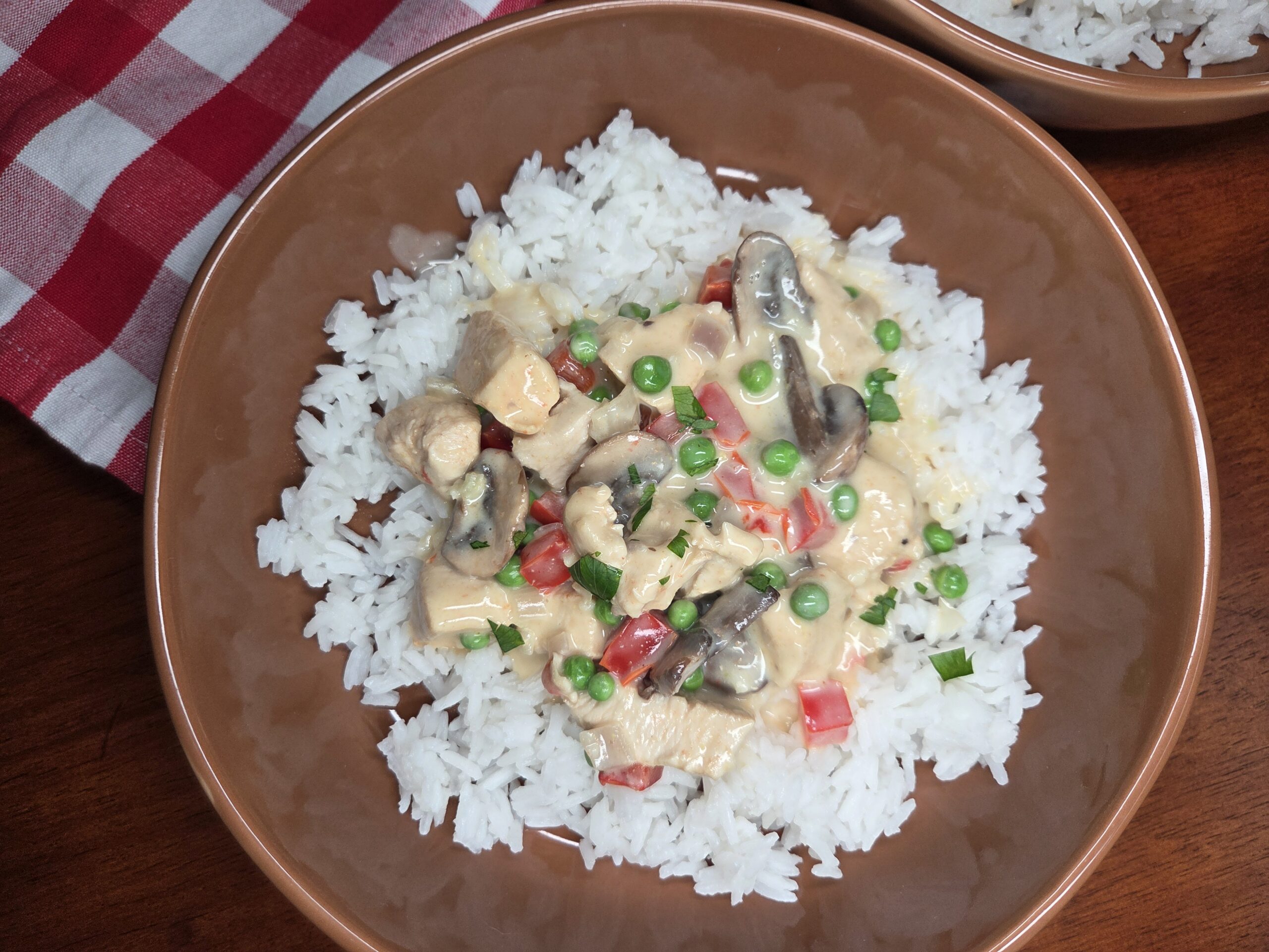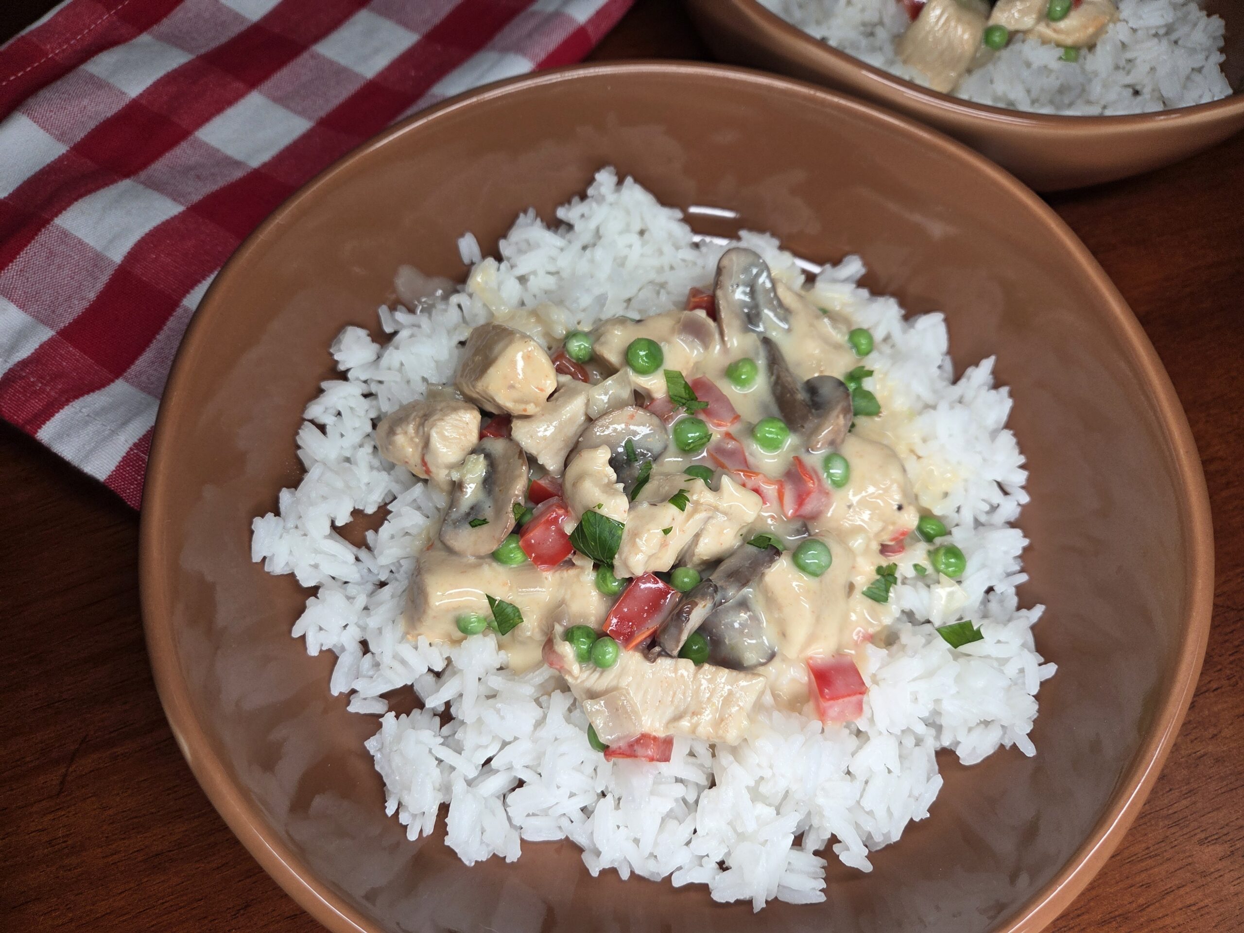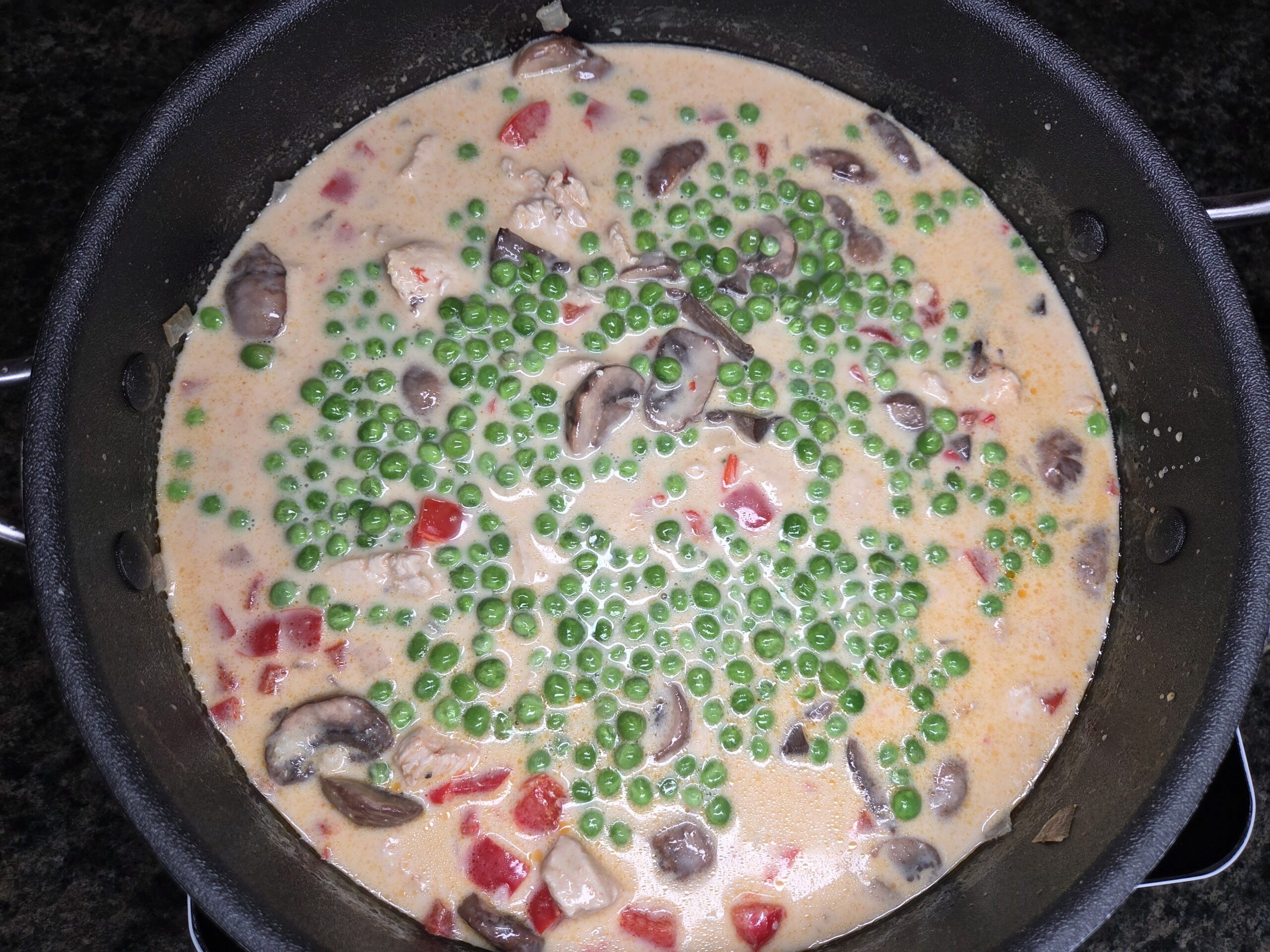 Quick, easy & delicious chicken with red bell peppers, shallots, mushrooms & peas in a creamy sauce.