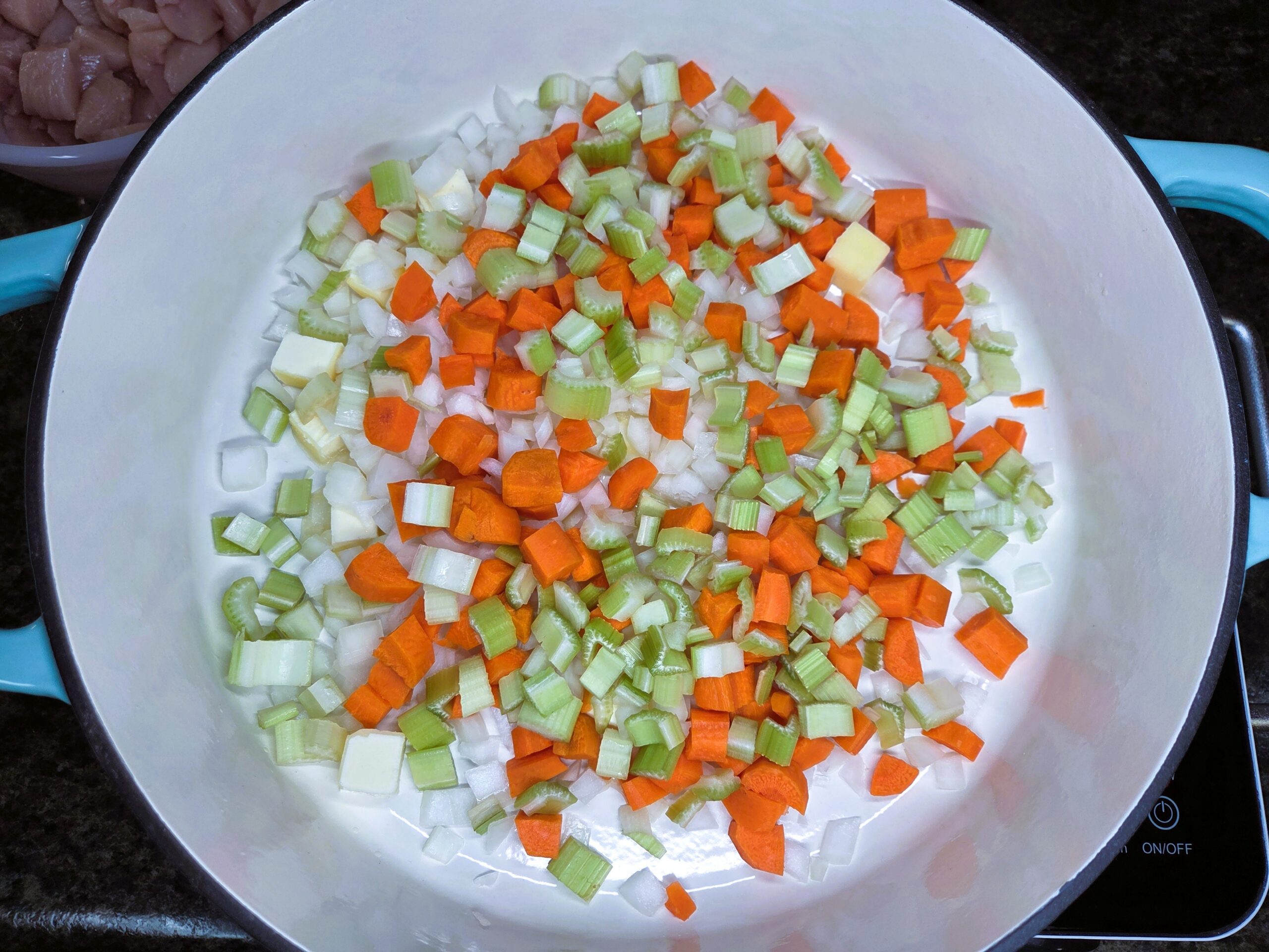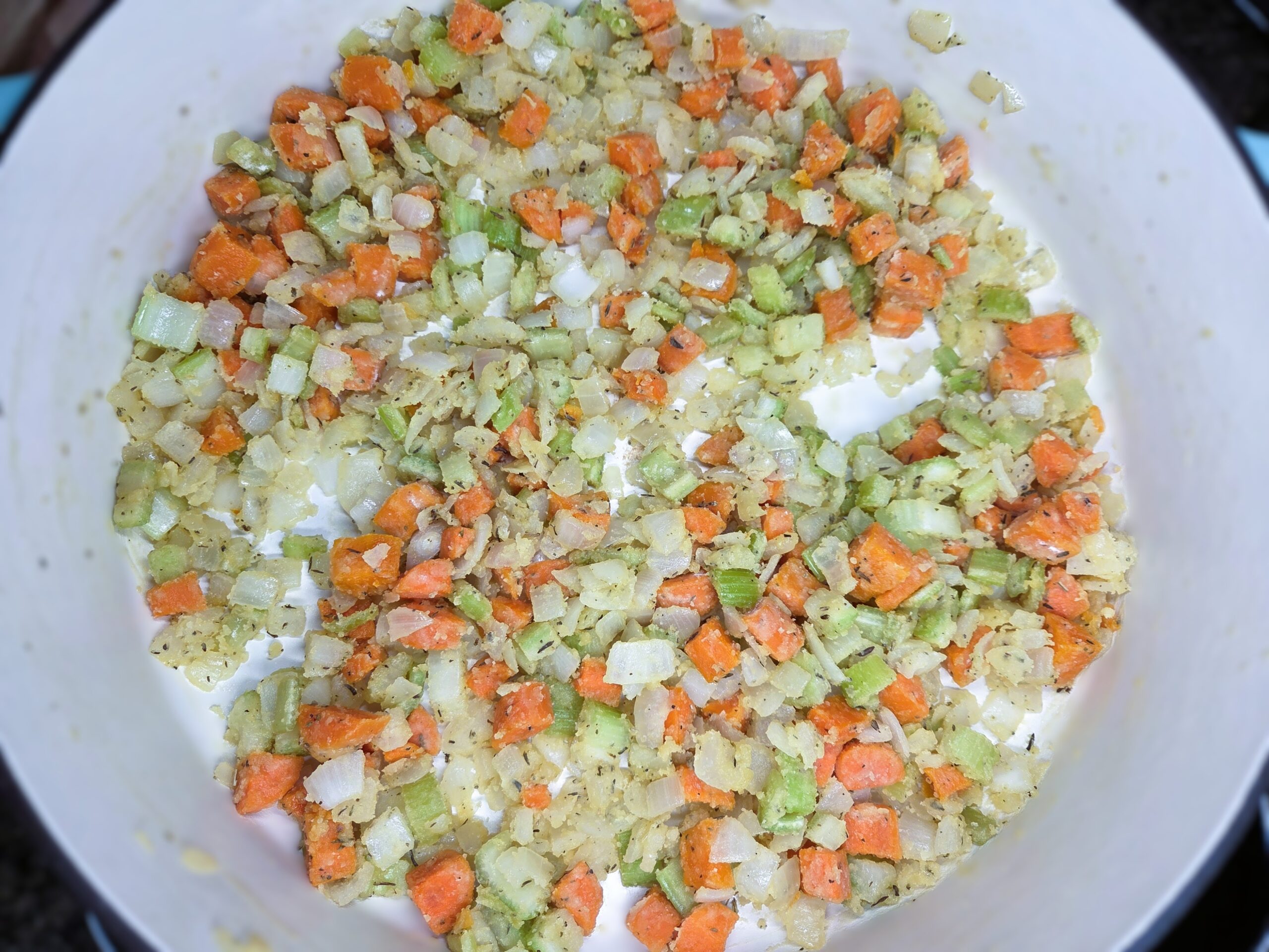 Dice 1 medium yellow onion and 2 celery ribs, then peel and dice 1 large carrot. In a large, heavy-bottomed pot, melt 1/4 cup of unsalted butter over medium heat. Add the diced vegetables and sauté for about 7 to 10 minutes until they start to soften. Mix in 1/2 teaspoon of dried thyme leaves, 1/2 teaspoon of rubbed sage, and season with salt and pepper to your liking, cooking for an additional 1-2 minutes.