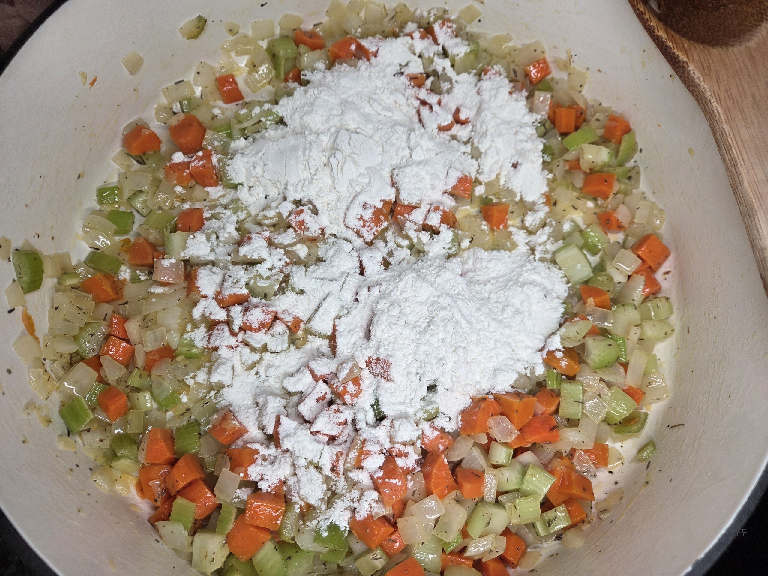 Stir in 1/2 cup of all-purpose flour, mixing until thoroughly combined, and cook for 1-2 minutes.