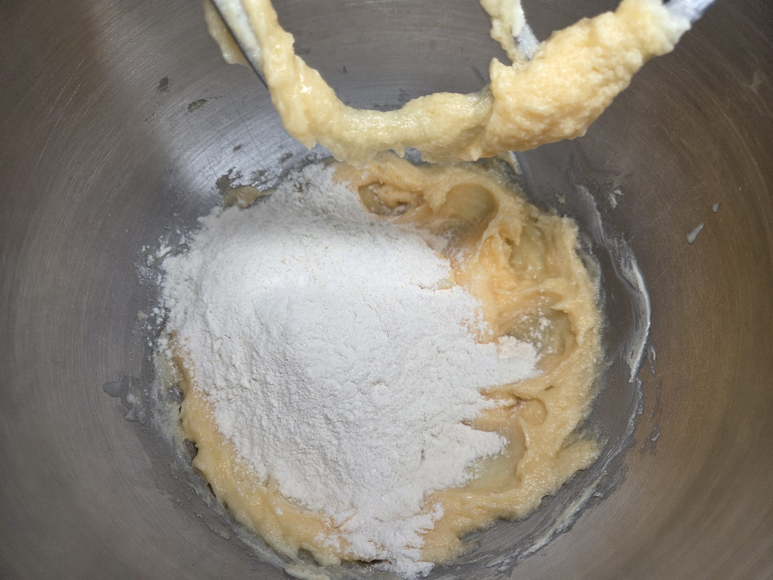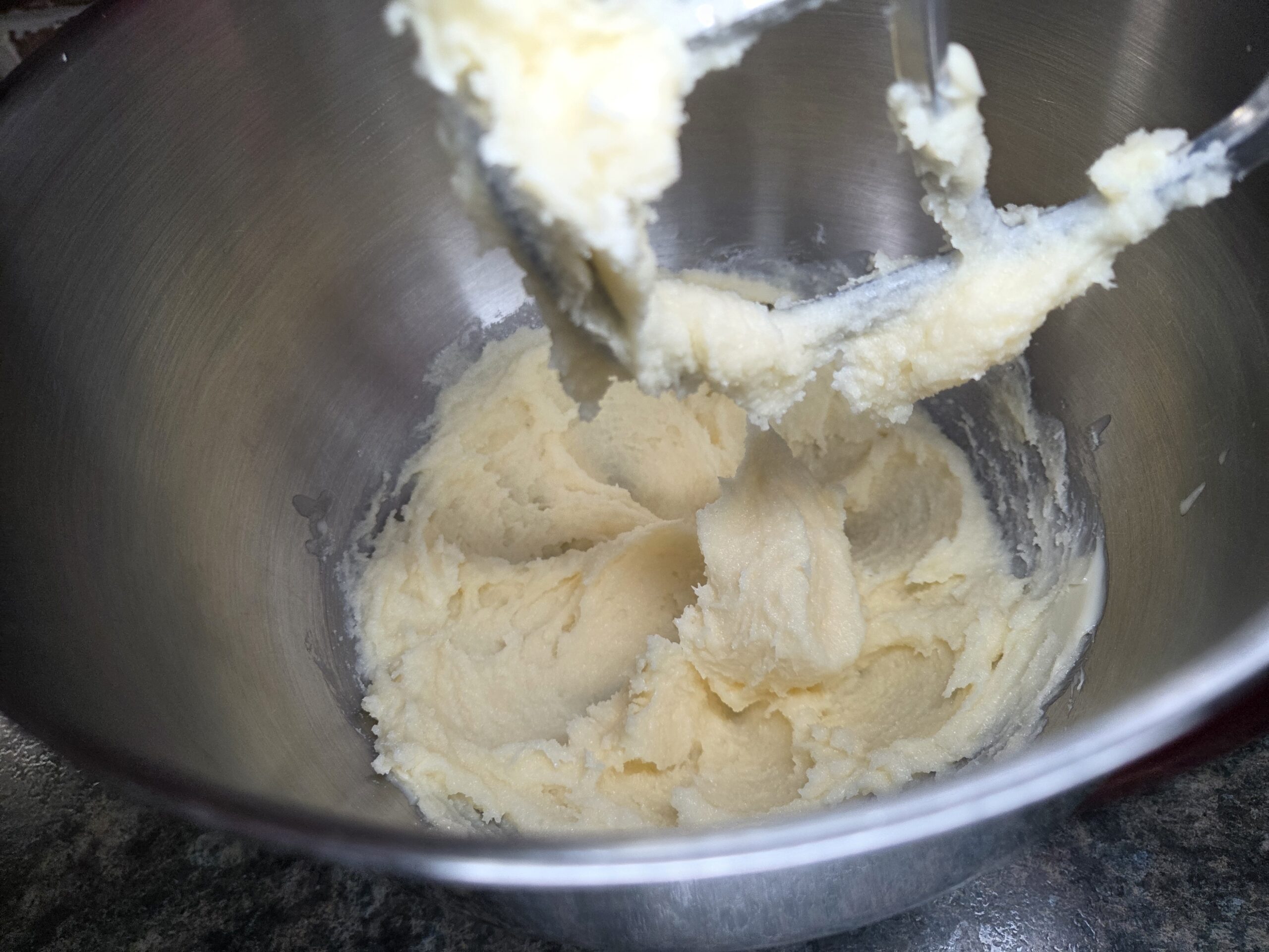 Preheat the oven to 350°F and line a baking sheet with parchment paper. With a hand or stand mixer, beat together 1 cup of softened unsalted butter and 1 cup of granulated sugar until fluffy.