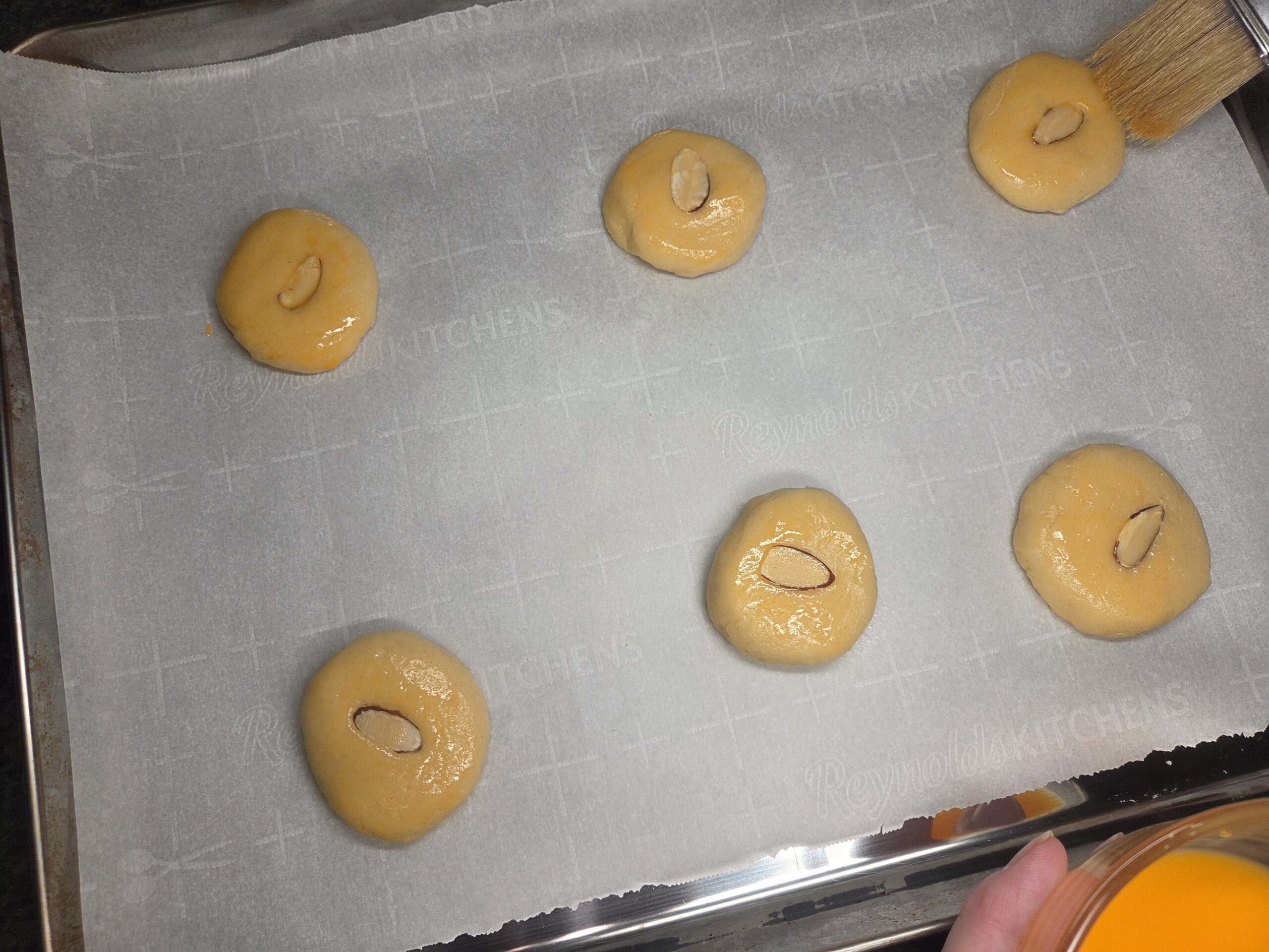 To make the egg wash, whisk 1 egg yolk with 1 teaspoon of cold water in a small bowl. Scoop tablespoon-sized portions of dough, roll them smooth in your hands, and gently flatten them on the baking sheet. For smaller cookies, use a teaspoon instead. Once on the baking sheet, place the desired number of almonds on the cookies and brush them with egg wash for that classic Chinese Almond Cookie shine.