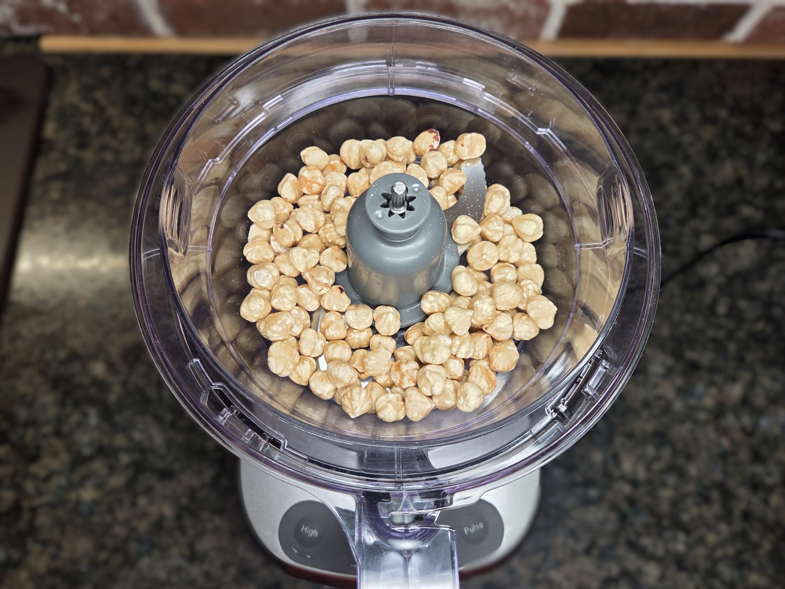 Make the cinnamon‑hazelnut paste. Add 1 cup of toasted hazelnuts to a food processor and pulse until they form a fine, sand‑like meal.