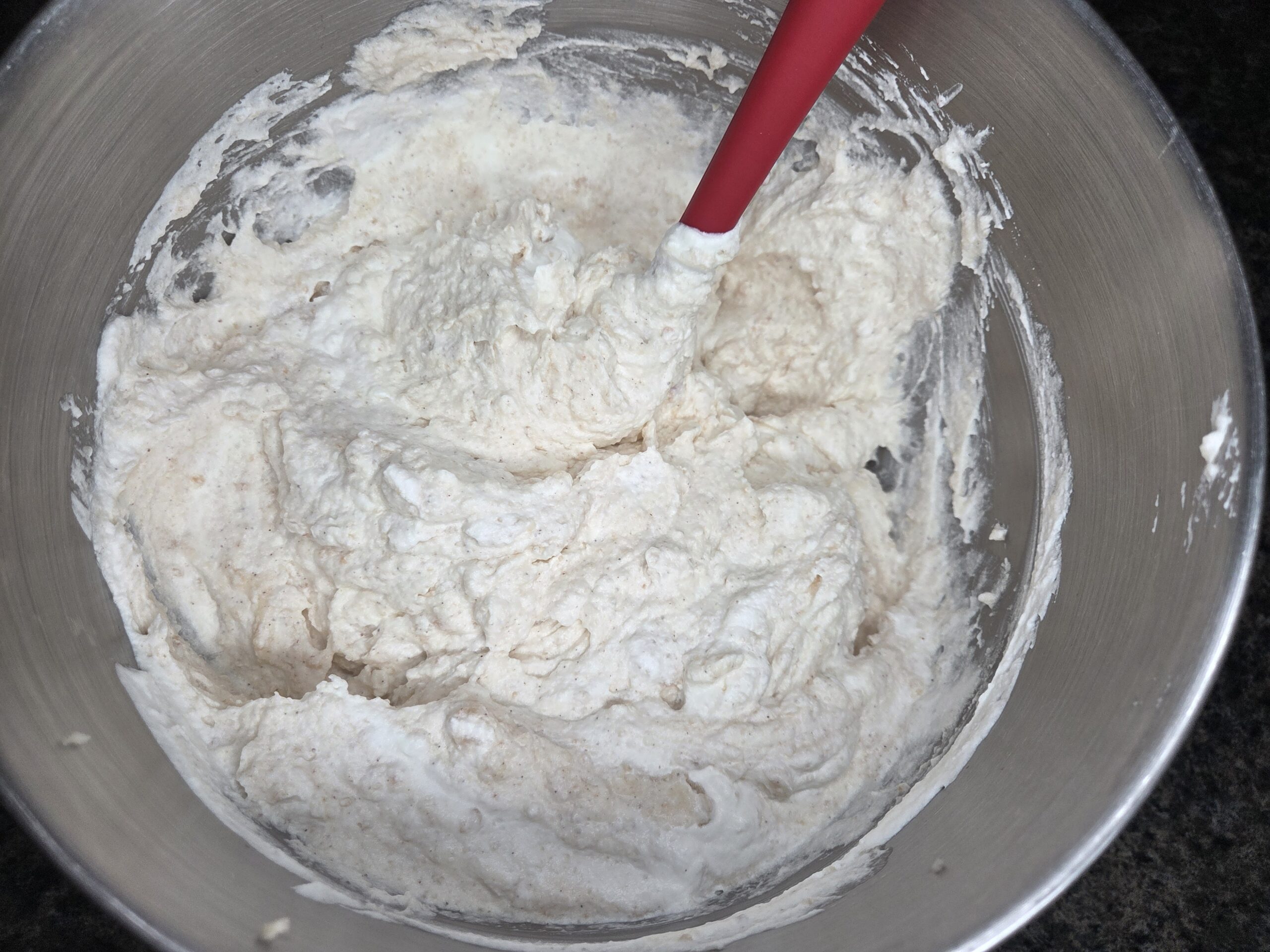 Gently fold the cinnamon‑hazelnut mixture into the whipped cream by hand. This becomes the filling for the tiramisù.